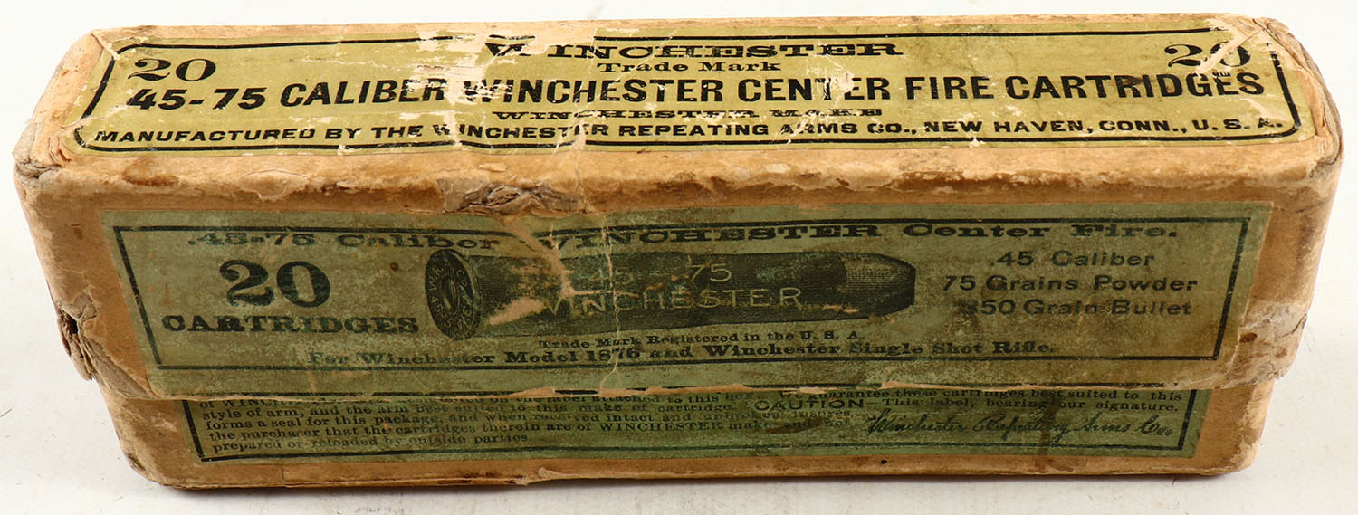 Winchester, .45-75 Winchester, 350 Grain Bullet, Full, 2pc. Buff box with green labels, box is solid with good color, some age soiling & color fading, shelf wear, edge & corner wear, labels are intact, ammo is excellent. Grade: Good ++ - Value: 70 to 210