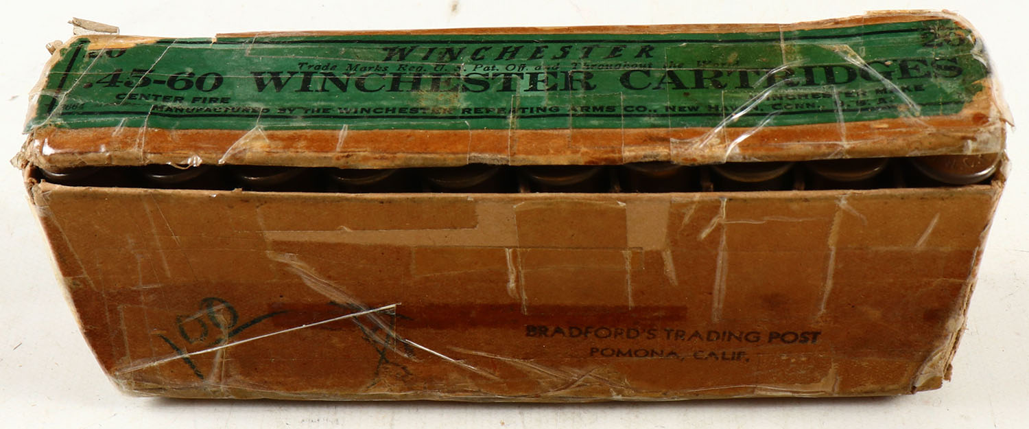 Winchester, .45-60, 300 Grain Bullet, Full, 2pc. Buff box with green labels, box is covered in tape, top is hinged by seam splits, very good color, some age soiling, edge & corner wear, labels are intact, ammo is excellent. Grade: Fair ++ - Value: 40 to 120