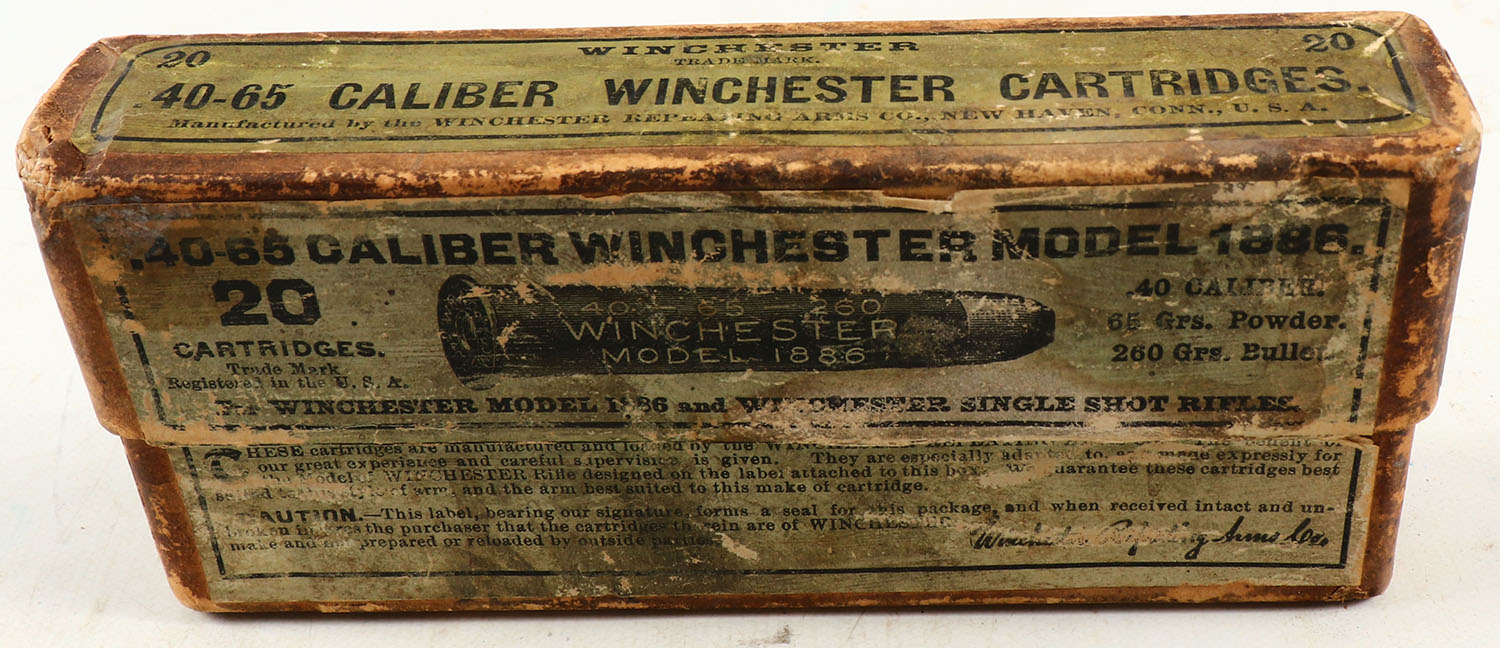 Winchester, .40-65 Winchester, 260 Grs. Bullet, Full, 2pc. Buff box with green labels, box is solid with good color, age soiling & shelf wear, some edge & corner wear, labels are intact, ammo is very good. Grade: Good ++ - Value: 60 to 180