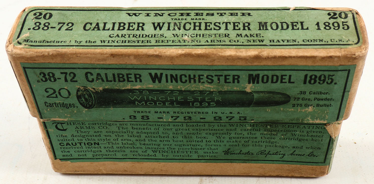 Winchester, .38-72 Winchester, 275 Grs. Bullet, Full of incorrect(?) ammo (W.R.A.Co. H/S with ''W'' brass primer), 2pc. Buff box with green labels, box is solid with very good to excellent color, some age soiling & shelf wear, minor edge & corner wear, labels are intact, ammo is excellent. Grade: Very Good ++ - Value: 50 to 150