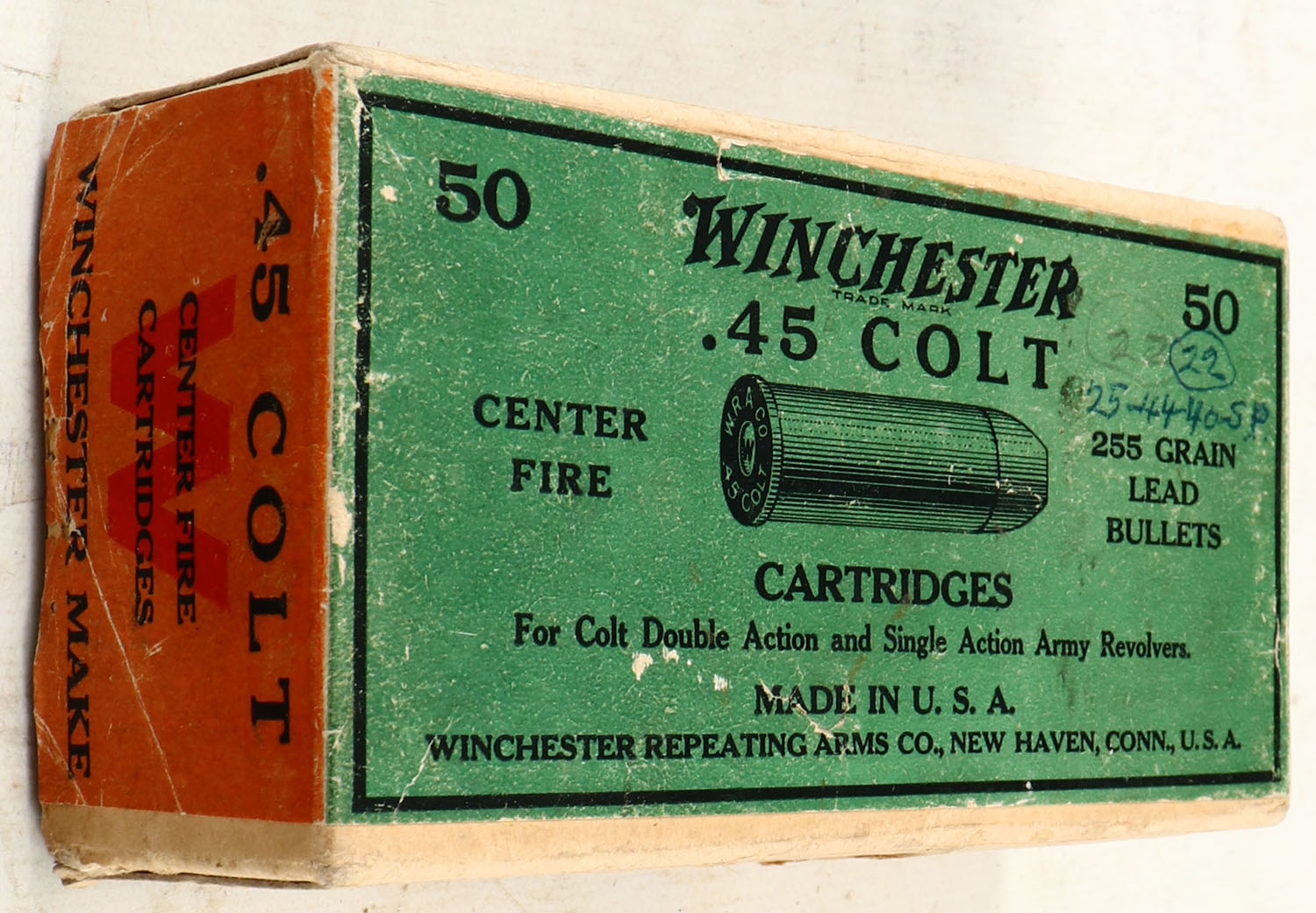 Winchester, Center Fire Cartridges, .45 Colt, 255 Grain Lead Bullets, Full of mixed primers, 2pc. Buff box with green & orange wraparound label, box is solid with excellent color, shelf wear, top & back side have been written on, minor edge & corner wear, tear to front of lid, label is intact, ammo is excellent. Grade: Very Good + - Value: 40 to 120