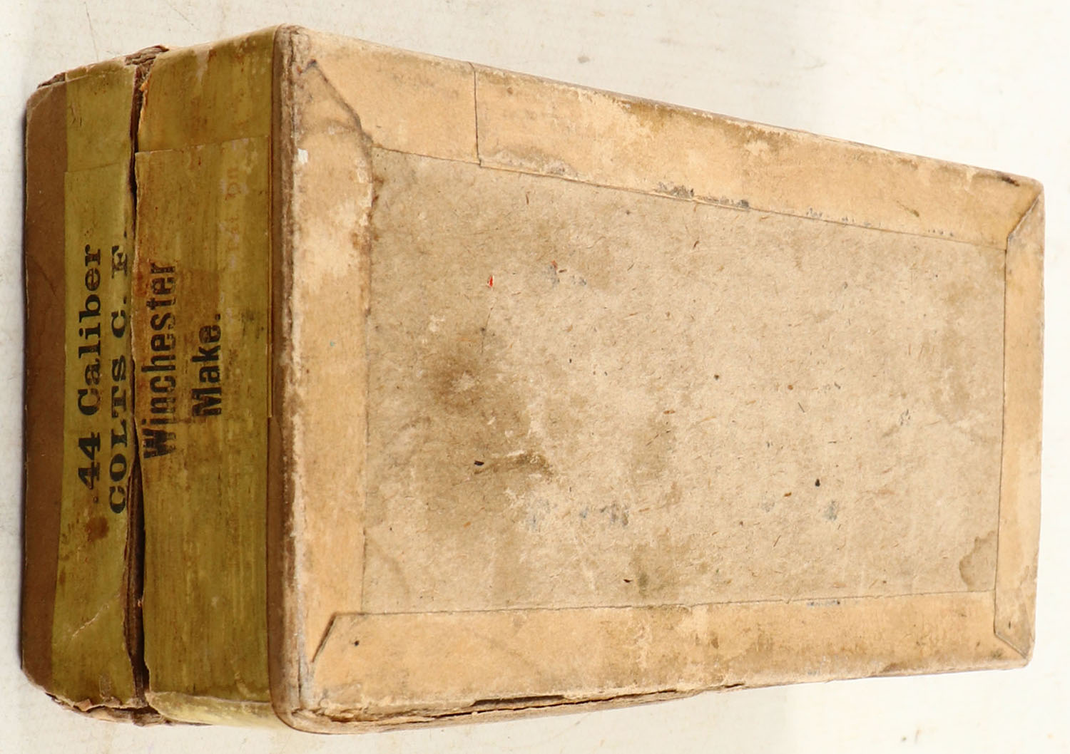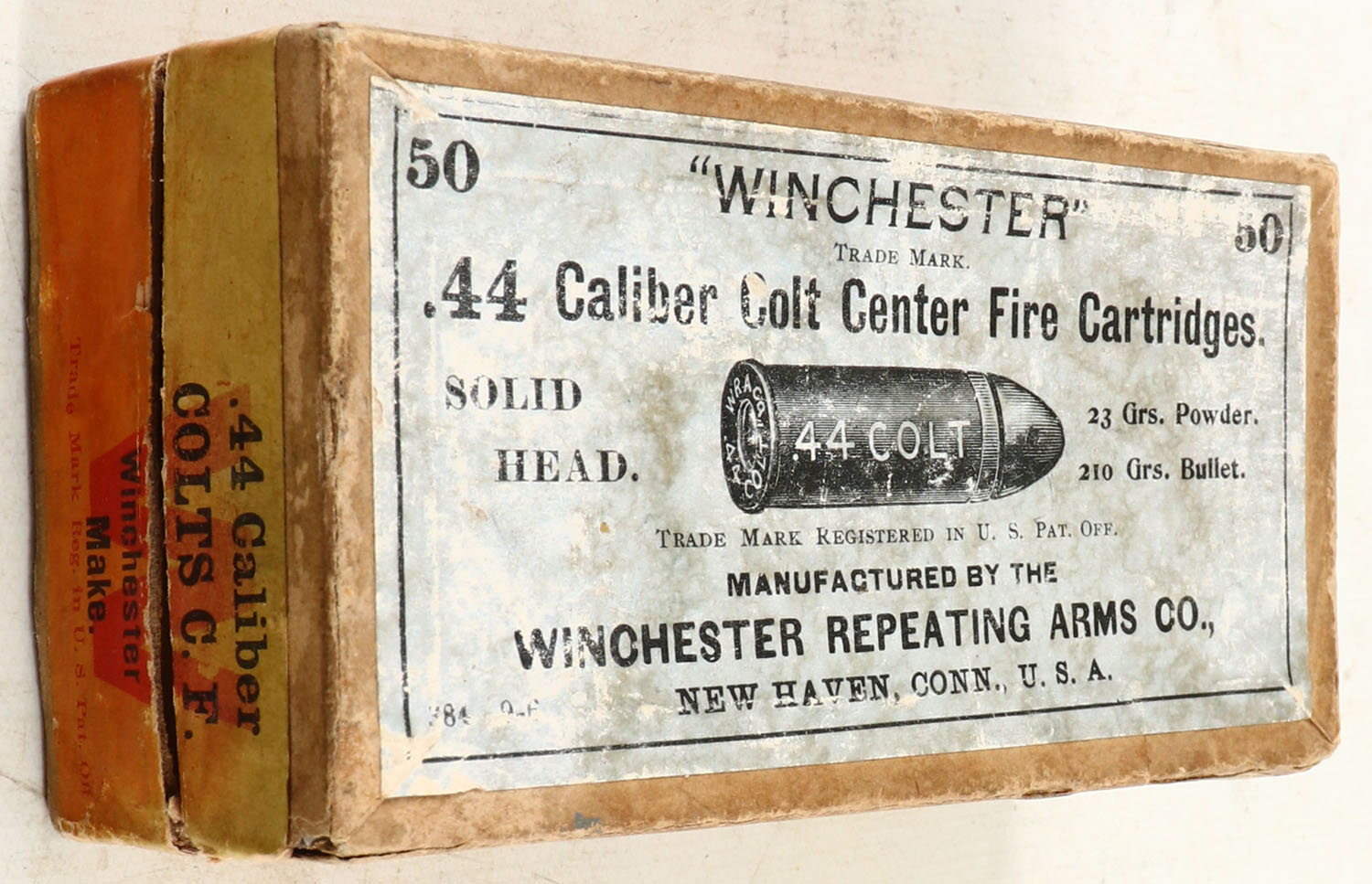 Winchester, Center Fire Cartridges, .44 Colt, 23 Grs. Powder, 210 Grs. Bullet, Full, 2pc. Buff box with green top & orange side sealing labels, box is solid with fair color, top label has faded to gray, side sealing label has faded to yellow, some age soiling, edge & corner wear, side sealing label is 95% intact, ammo is very good. Grade: Very Good - Value: 100 to 300