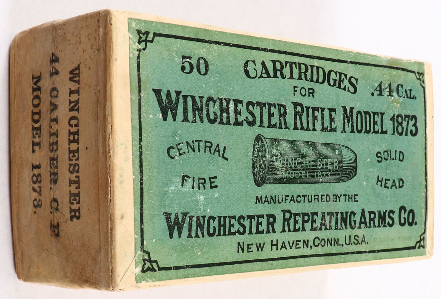 Winchester, Central Fire Solid Head, .44 Winchester Center Fire, FULL & SEALED, 2pc. Buff box with green top & buff side sealing labels, box is solid with excellent color, very minor shelf & corner wear, edges are crisp, labels are intact. Grade: Excellent + - Value: 400 to 1200