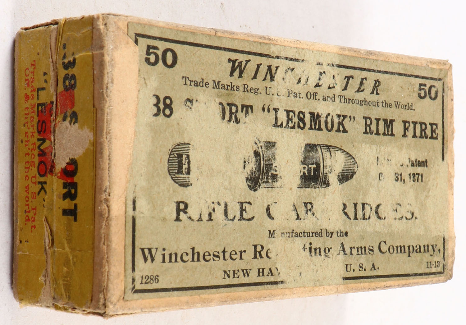 Winchester, Rifle Cartridges, .38 Short Rim Fire, ''Lesmok'', Full, 2pc. Buff box with green top & yellow side sealing labels, box is solid with good to very good color, top appears to have tape damage, minor age soiling, corner wear, some edge wear, labels are intact, ammo is very good. Grade: Good ++ - Value: 30 to 90