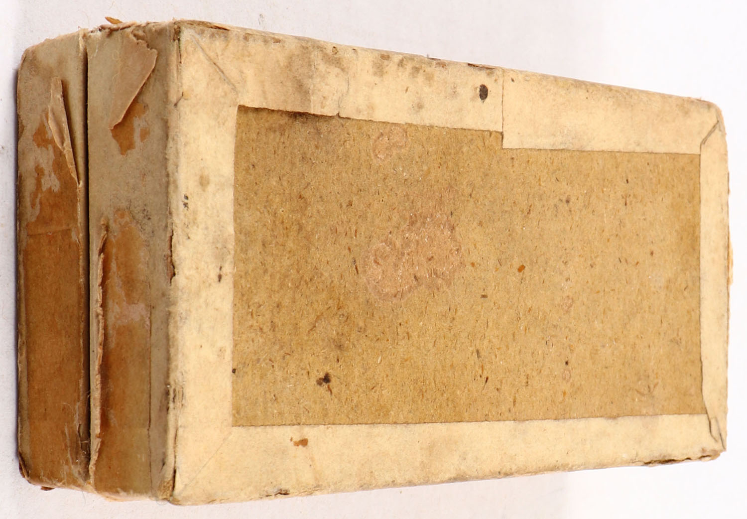 Winchester, .38 Smith & Wesson Center Fire, Partial 20rds. Of incorrect ammo, 2pc. Buff box with green top & orange side sealing labels, box is solid with good color, age soiling, shelf wear, edge & corner wear, labels are 99% intact, ammo is excellent. Grade: Good - Value: 8 to 40