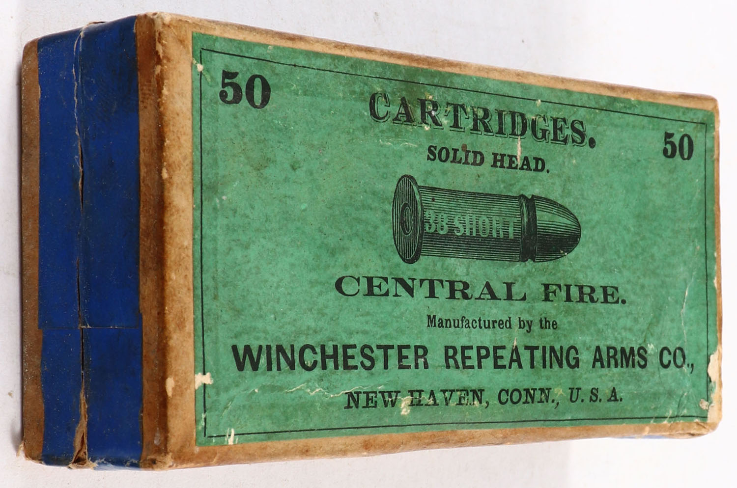 Winchester, Central Fire, .38 Short, Partial 20rds., 1pc. Buff box with green top & blue side sealing labels, box is solid with very good color, some age soiling, corner ding on top right corner, very minor shelf wear, some edge & corner wear, labels are intact, ammo is very good. Grade: Good ++ - Value: 8 to 40
