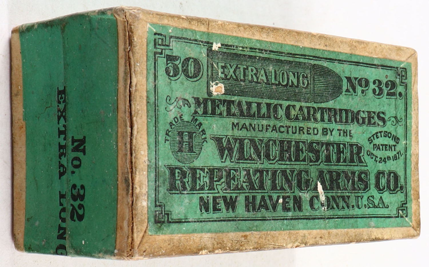 Winchester, Metallic Cartridges, .32 Extra Long, FULL & SEALED, 2pc. Buff box with green top & side sealing labels, box is solid with very good color, some age soiling & corner wear, minor edge wear, labels are intact. Grade: Very Good ++ - Value: 60 to 180
