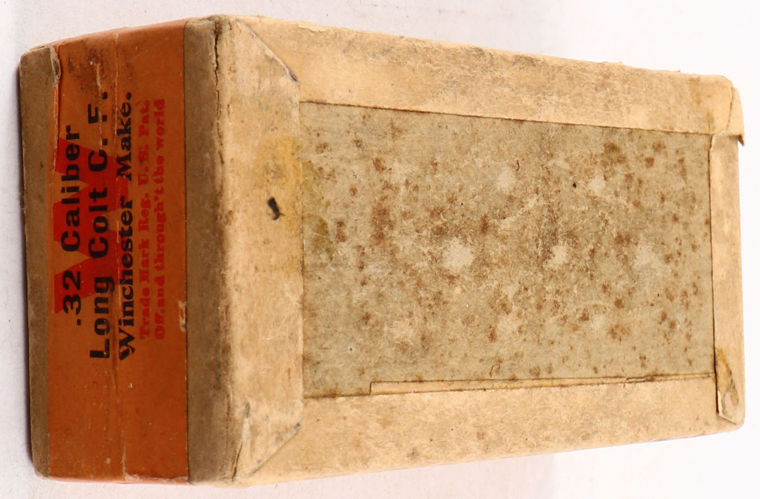 Winchester, .32 Long Colt, Solid Head, FULL & SEALED, 2pc. Buff box with green top & orange side sealing labels, box is solid with very good to excellent color, minor age soiling & color fading, minor edge & corner wear, labels are intact. Grade: Excellent - Value: 80 to 240