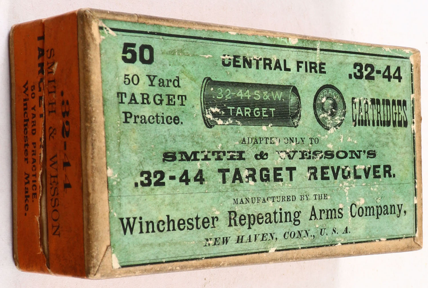 Winchester, Central Fire, .32-44 Smith & Wesson Target, Full with insert, 2pc. Buff box with green top & orange side sealing labels, box is solid with excellent color, minor age soiling & shelf wear, very minor corner wear, edges are crisp, labels are intact, sticker on bottom, insert is minty, ammo is excellent. Grade: Excellent - Value: 50 to 200