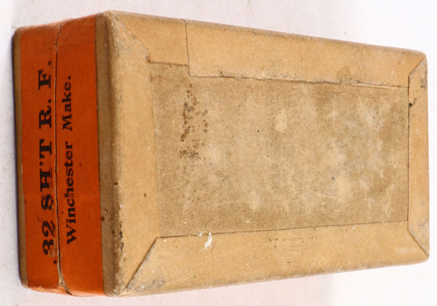 Winchester, Rifle Cartridges, .32 Short Rim Fire, Full, 2pc. Buff box with green top & orange side sealing label, box is solid with excellent color, minor age soiling, very minor corner wear, edges are crisp, labels are intact, ammo is poor. Grade: Excellent - Value: 50 to 150