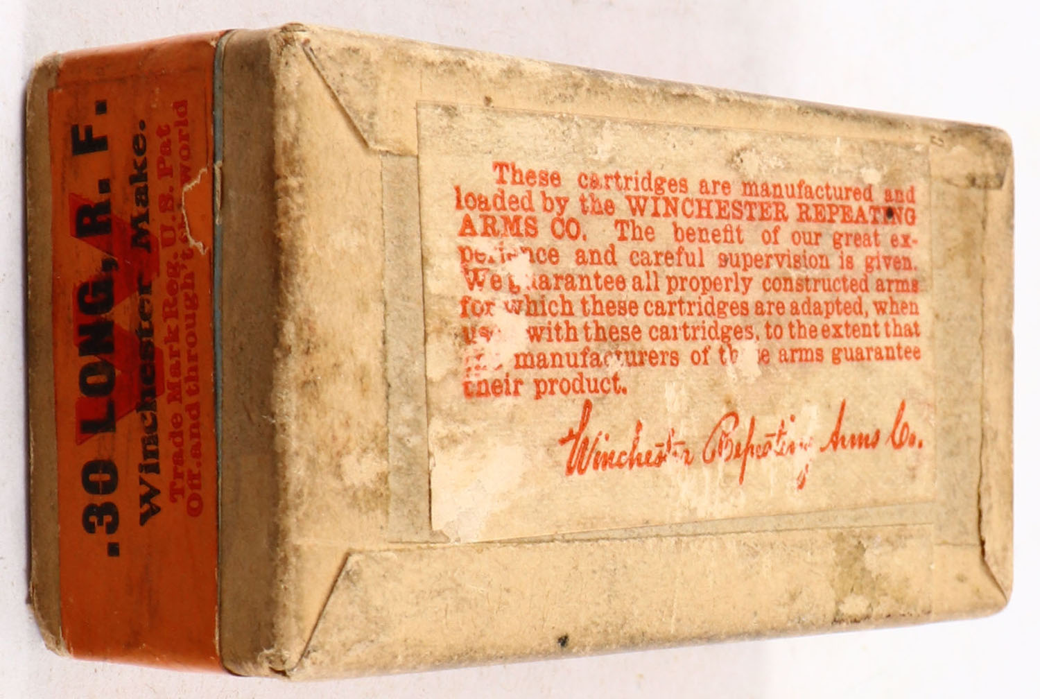 Winchester, Metallic Cartridges, .30 Long Rim Fire, FULL & SEALED, 2pc. Buff box with green top & orange side sealing labels, box is solid with very good to excellent color, minor age soiling, some shelf & corner wear, very minor edge wear, labels are intact. Grade: Very Good ++ - Value: 30 to 90