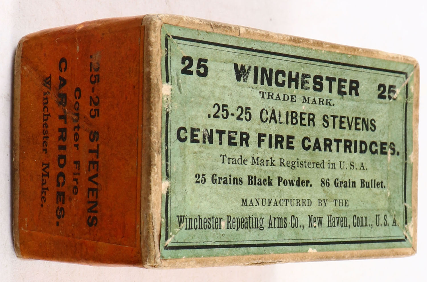 Winchester, Center Fire Cartridges, .25-25 Stevens, FULL & SEALED, 2pc. Buff box with green top & orange side sealing labels, box is solid with excellent color, very minor age soiling & shelf wear, very minor edge & corner wear, labels are intact. Grade: Excellent - Value: 100 to 300