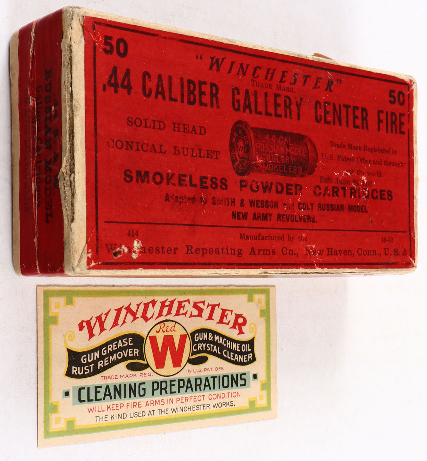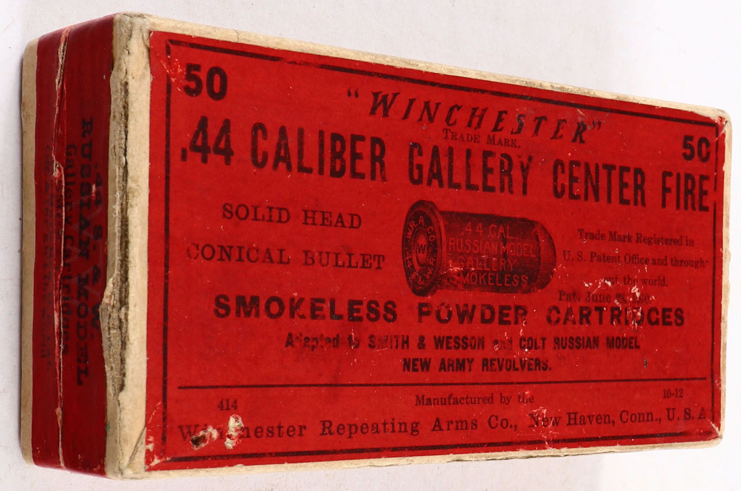Winchester, Smokeless Powder Cartridges, .44 Smith & Wesson Russian, Gallery Center Fire, Full with insert, 2pc. Buff box with red top & side sealing labels, box is solid with excellent color, minor shelf & edge wear, very minor corner wear, partial seam split to right edge of lid, insert is minty, ammo is excellent. Grade: Excellent - Value: 50 to 150