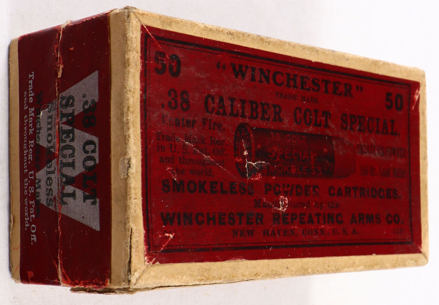 Winchester, Smokeless Powder Cartridges, .38 Colt Special, 158 Gr. Lead Bullet, Full, 2pc. Buff box with red top & side sealing labels, box is solid with excellent color, very minor age soiling, vertical seam split to front left corner of lid, partial seam split to top front edge, minor corner wear, very minor edge wear, labels are intact, ammo is excellent. Grade: Excellent + - Value: 40 to 120