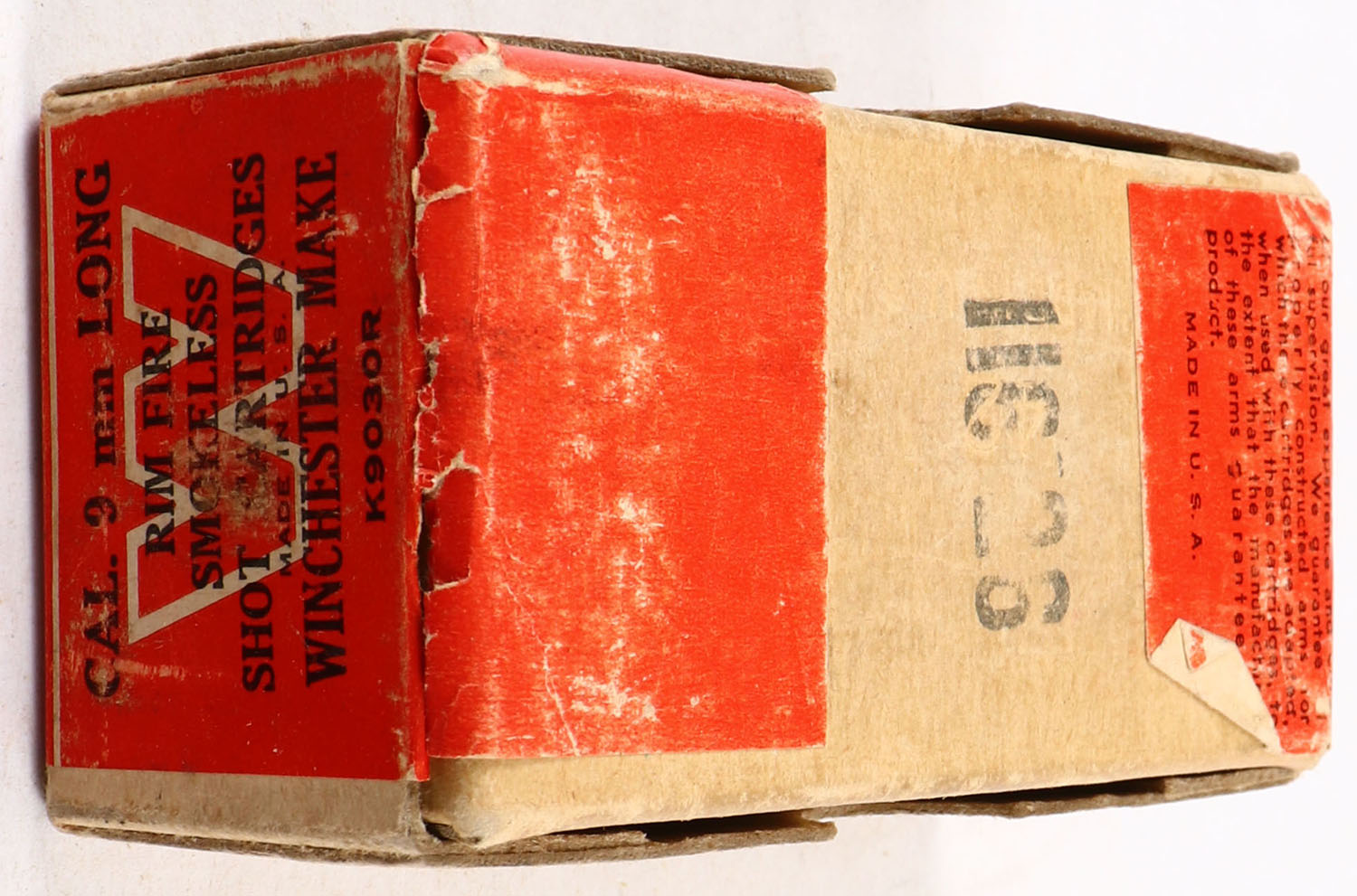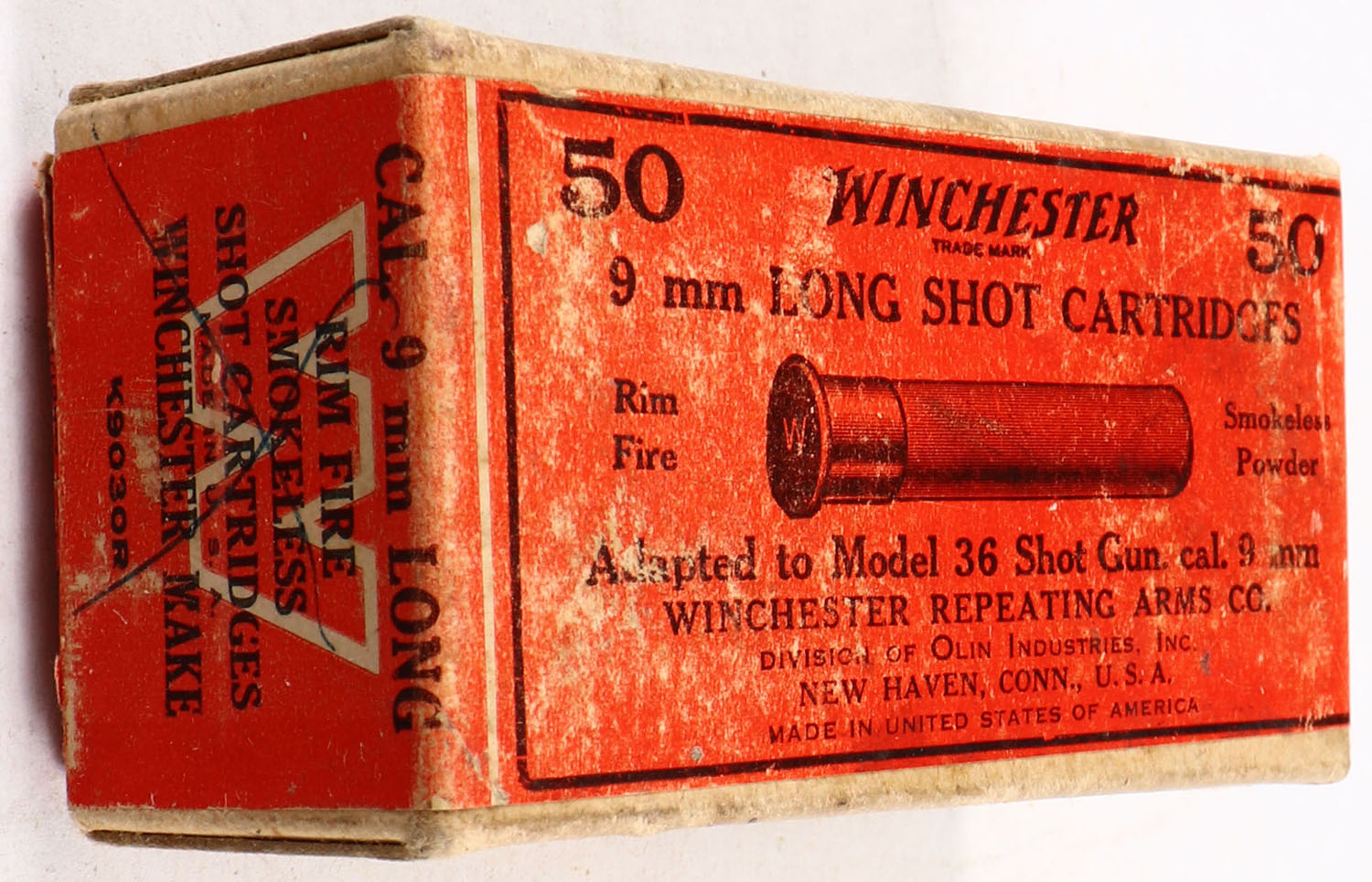 Winchester, Long Shot Cartridges, 9mm Rim Fire, Smokeless Powder, Full, 2pc. Buff box with red wraparound label, box is solid with very good to excellent color, some shelf wear, very minor edge & corner wear, label is intact, ammo is excellent. Grade: Excellent - Value: 150 to 450
