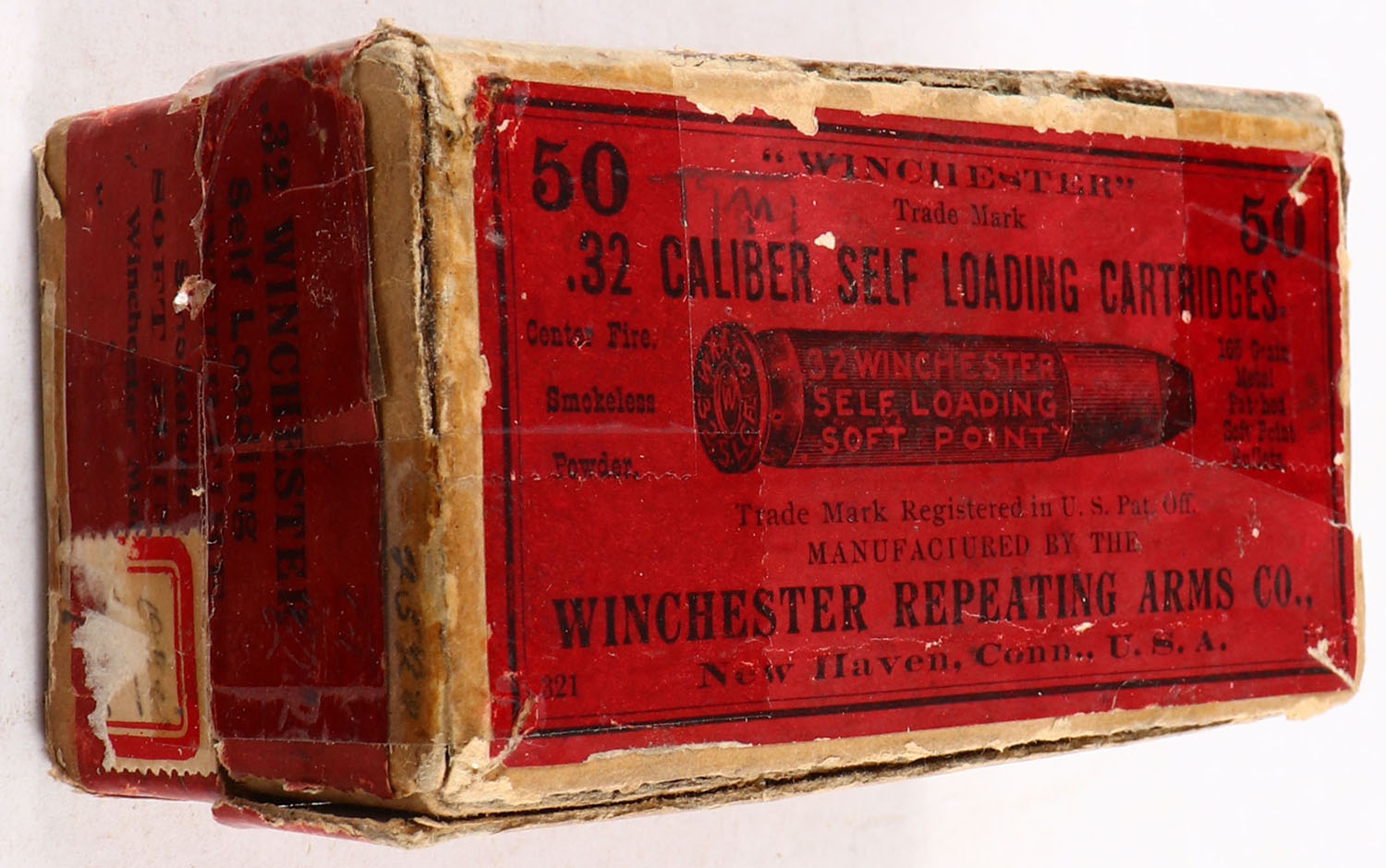 Winchester, Smokeless Powder, .32 Winchester Self Loading, 165 Grain Metal Patched Soft Point Bullets, Full, 2pc. Buff box with red top & side sealing labels, box has several seam splits and is held together by tape, very good color, some age soiling, top has been written on, edge wear, corner wear, labels are intact, ammo is excellent. Grade: Fair - Value: 30 to 90