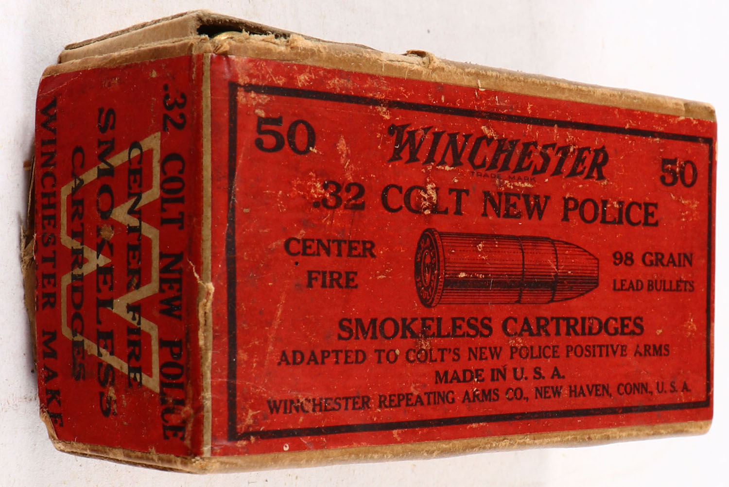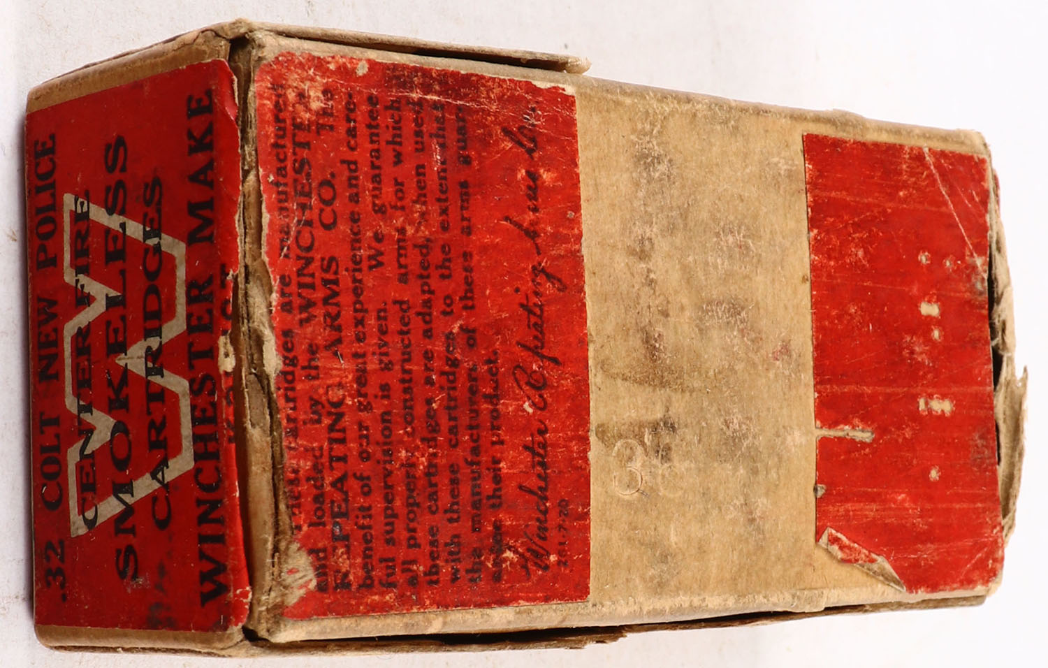 Winchester, Smokeless Cartridges, .321 Colt New Police, 98 Grain Lead Bullets, Full, 2pc. Buff box with red wraparound label, box is solid with very good color, some age soiling, minor shelf wear, back side of lid is torn, front has been written on, some edge & corner wear, seam splits to bottom right and bottom left edges, label is intact, ammo is excellent. Grade: Good ++ - Value: 16 to 60