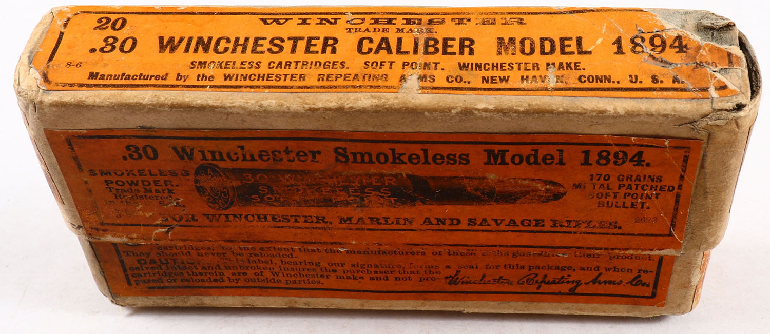 Winchester, Smokeless Cartridges, .30 Winchester (.30-30), 170 Grains Metal Patched Soft Point Bullet, Full, 2pc. Buff box with orange labels, box is solid with very good color, some age soiling & shelf wear, corner wear, minor edge wear, labels are intact, ammo is very good. Grade: Very Good - Value: 20 to 60