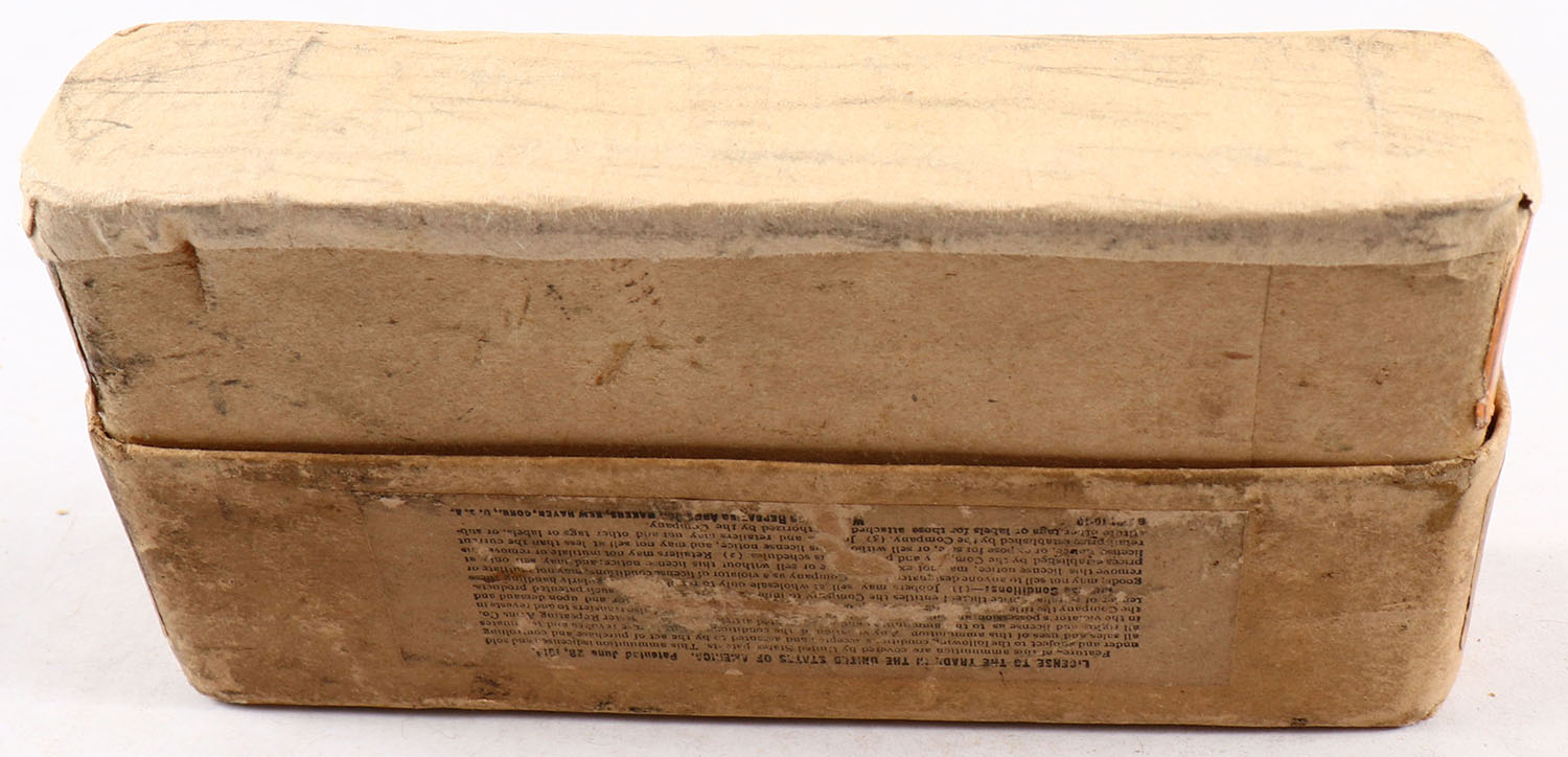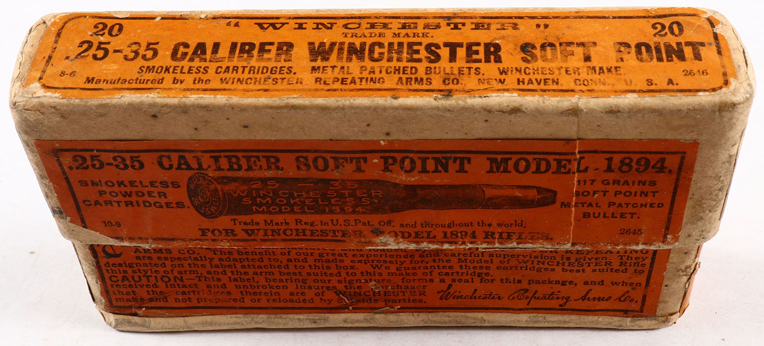 Winchester, Smokeless Cartridges, .25-35 Winchester, 117 Grains Soft Point Metal Patched Bullet, Full, 2pc. Buff box with orange labels, box is solid with very good to excellent color, minor age soiling & staining, some corner wear, very minor edge wear, tape on bottom. labels are intact, ammo is very good to excellent. Grade: Very Good + - Value: 30 to 120