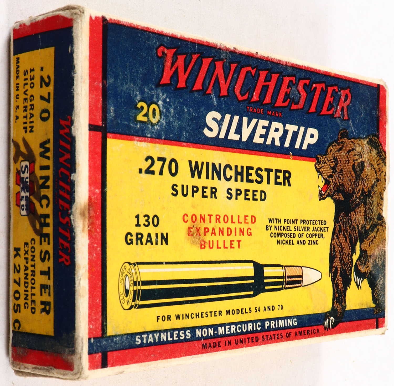 Winchester, Silvertip, .270 Winchester, 130 Grain Controlled Expanding Bullet, Full, 1pc. Yellow blue & red bear box, box is solid with excellent color, minor shelf wear, very minor staining on top, some edge & corner wear, end flaps are solid, ammo is excellent. Grade: Excellent - Value: 40 to 120