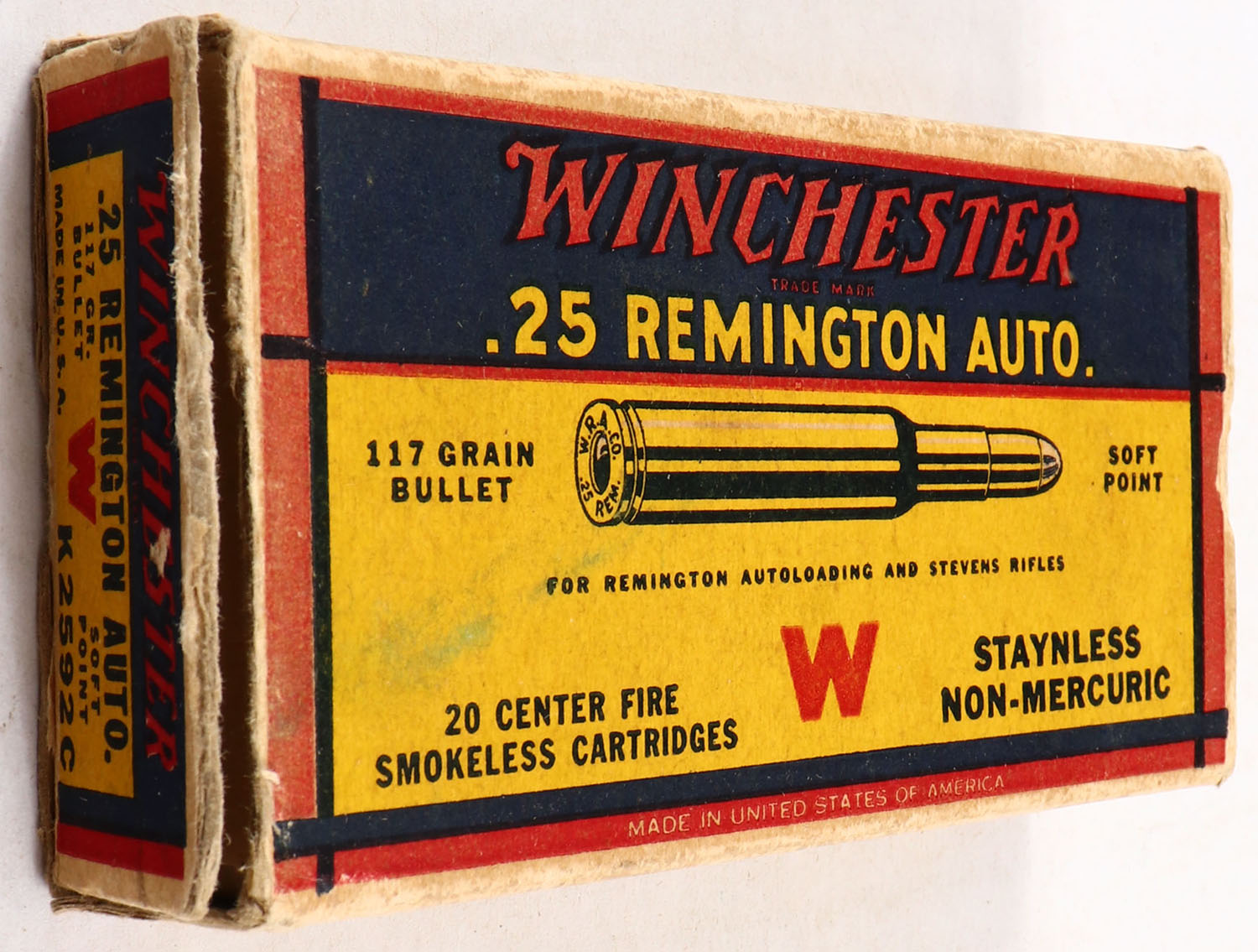Winchester, Staynless Non-Mercuric, .25 Remington Auto., Full, 1pc. Yellow blue & red box, left end flap is torn, very good to excellent color, some color fading, minor edge & corner wear, right end flap is solid, ammo is excellent. Grade: Very Good + - Value: 40 to 120