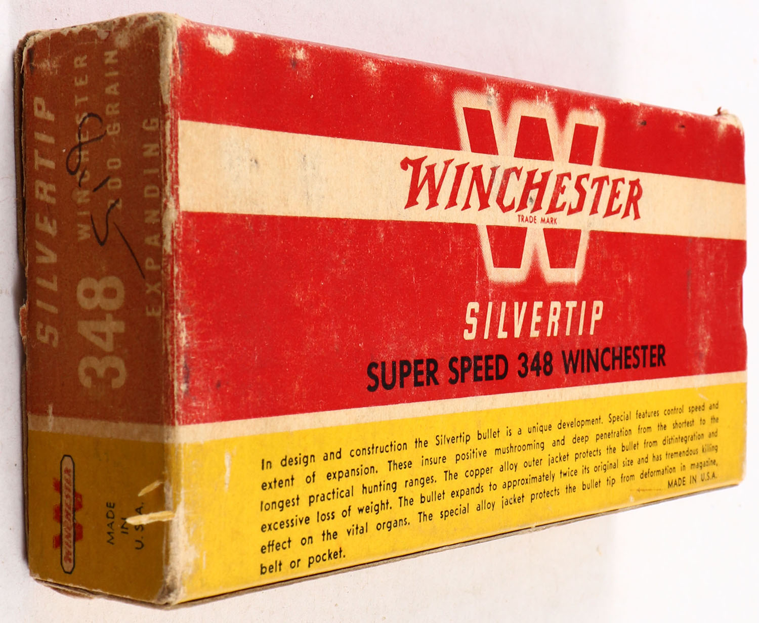 Winchester, Silvertip, .348 Winchester, 200 Grain Controlled Expanding Bullet, Full, 1pc. Red yellow & white box, box is solid with excellent color, box has age soiling and scuffing, has edge & corner wear, end flaps are solid, ammo is excellent. Grade: Very Good ++ - Value: 50 to 150