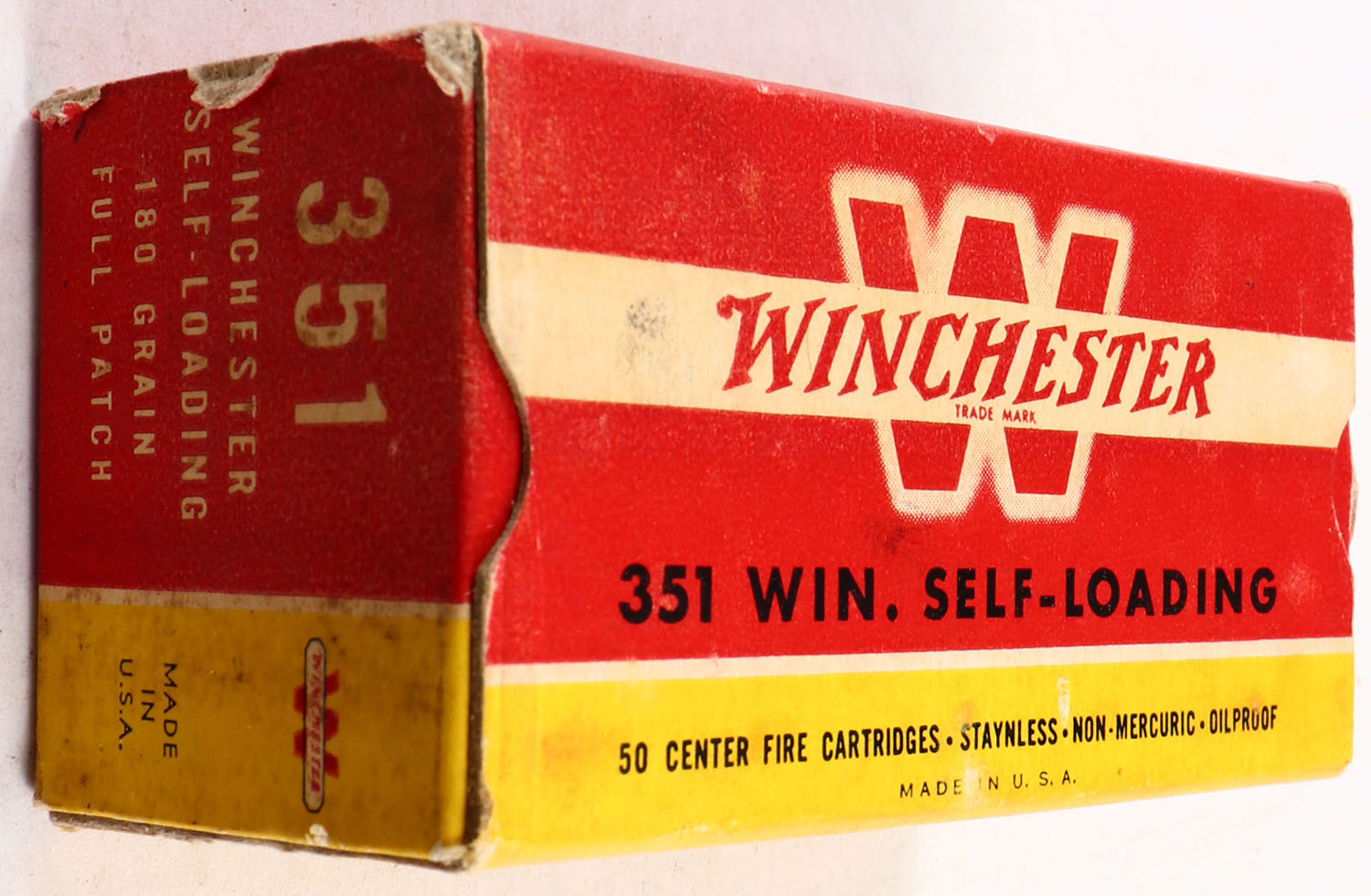 Winchester, .351 Win. Self-Loading, 180 Grain Soft Point, Full, 1pc. Red yellow & white box, box is solid with very good to excellent color, minor age soiling, very minor shelf wear, minor edge & corner wear, end flaps are solid, ammo is excellent. Grade: Excellent + - Value: 80 to 160