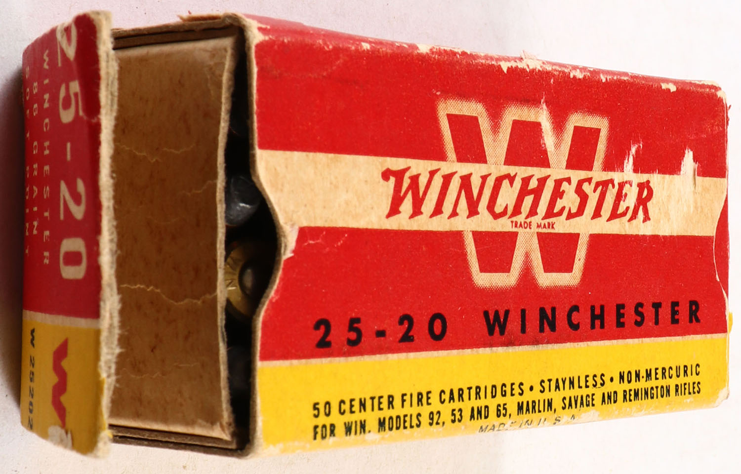 Winchester, .25-20 Winchester, 86 Grain Soft Point, Full, 1pc. Red yellow & white box, box is solid with excellent color, box has light age soiling & scuffing, very minor corner and edge wear, insert tab of left end is missing, right end flap is solid, ammo is excellent. Grade: Excellent - Value: 100 to 250