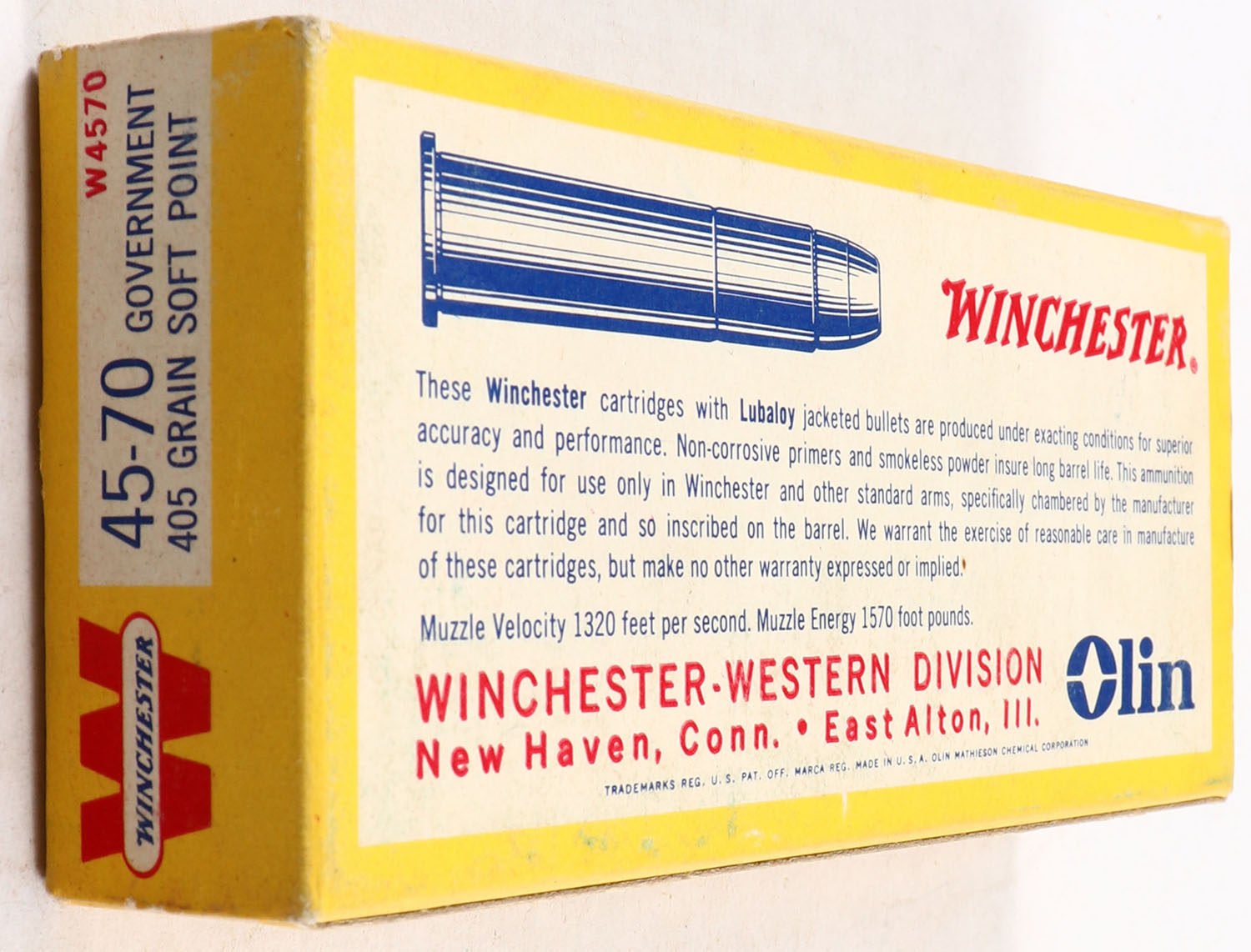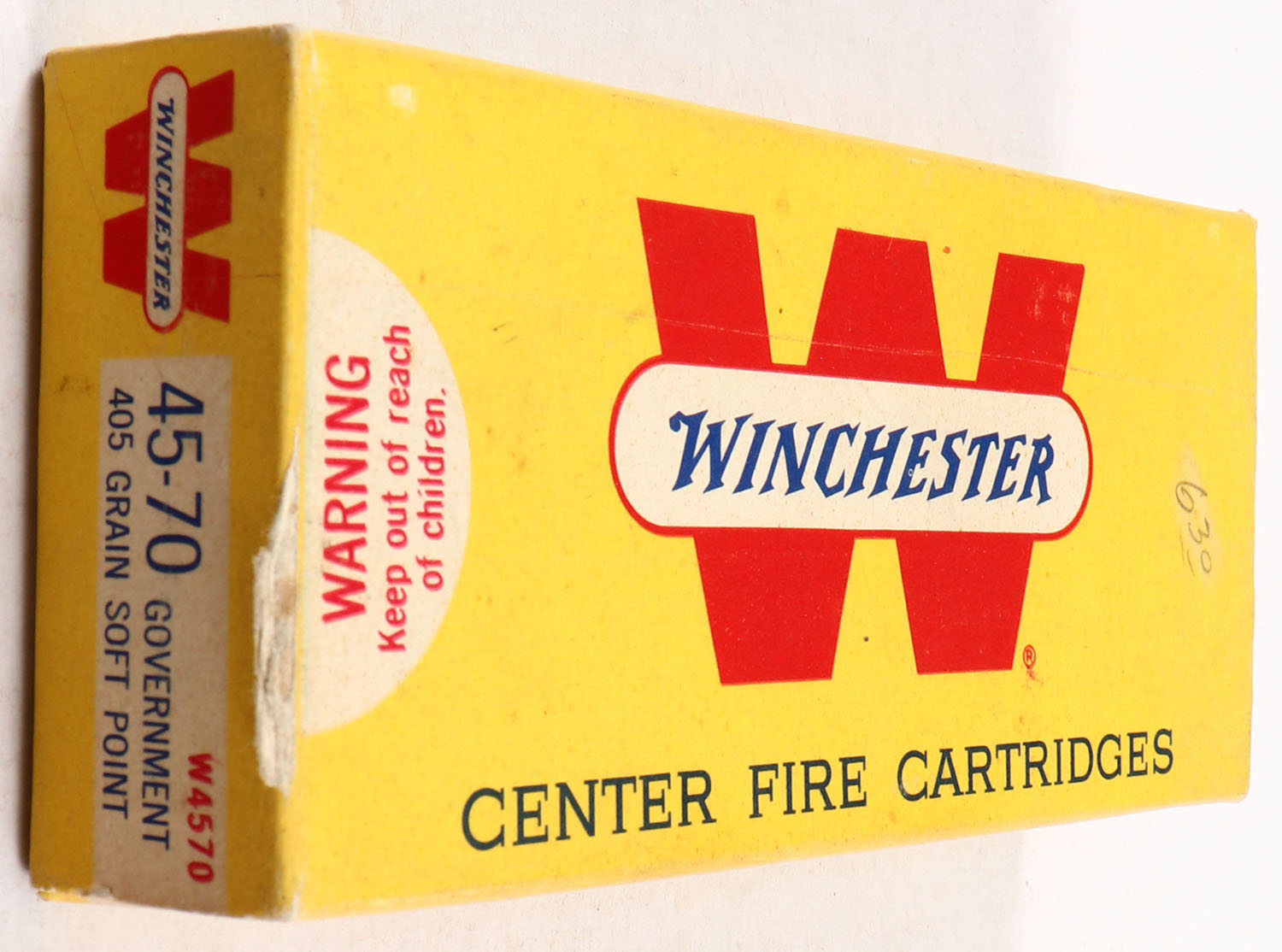 Winchester, .45-70 Government, 405 Grain Soft Point, Full, 1pc. Yellow red & white box, box is solid with excellent color, very minor age soiling, very minor edge & corner wear, top has been written on, end flaps are solid, ammo is minty. Grade: Excellent - Value: 20 to 60