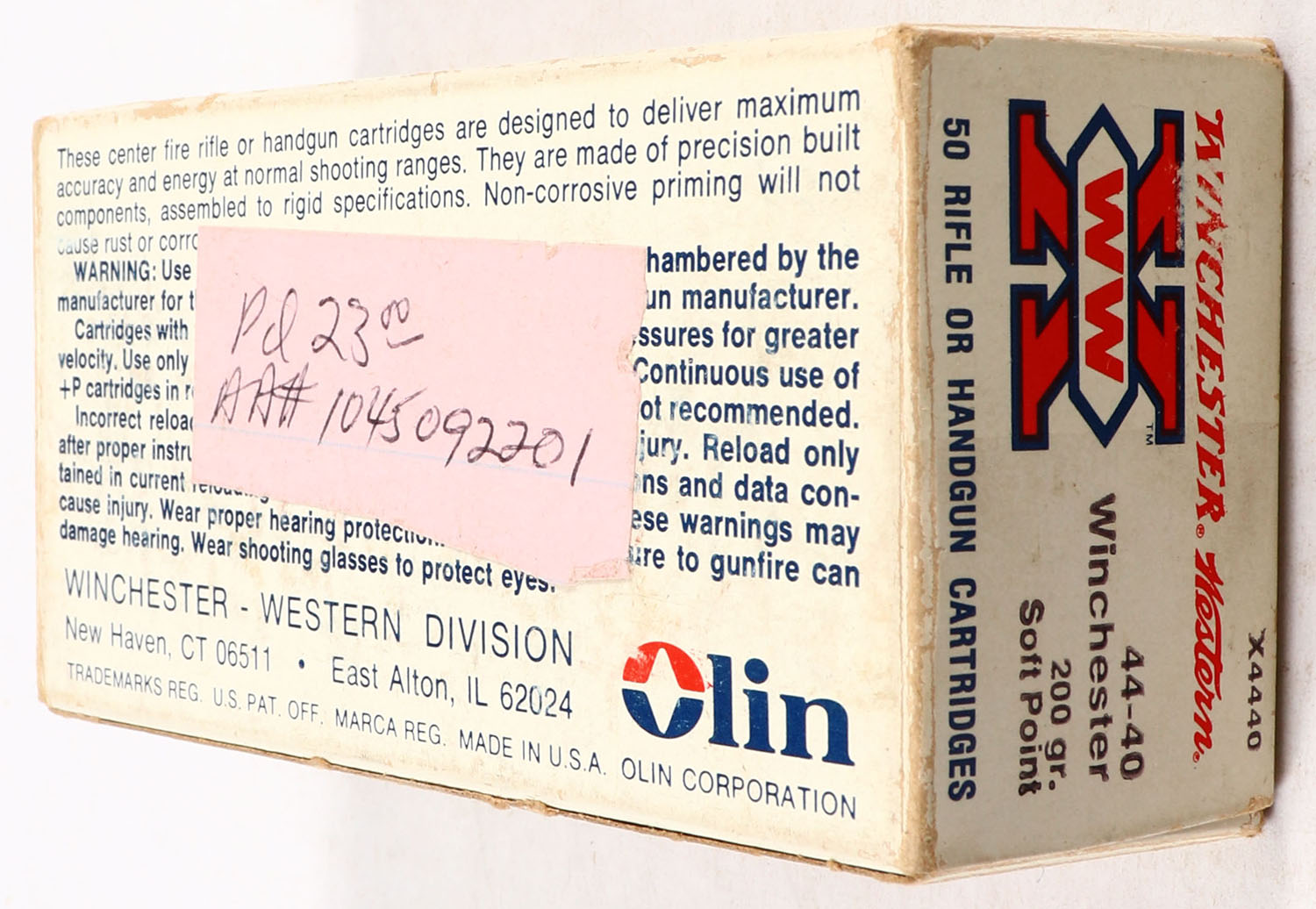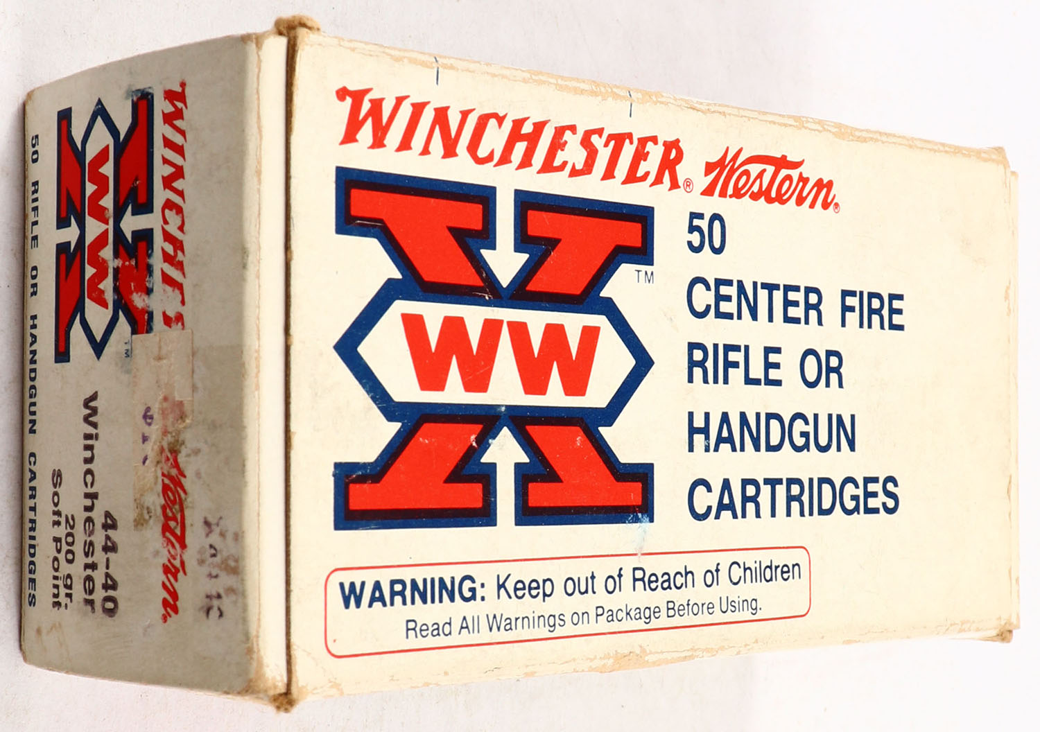 Winchester-Western, X, .44-40 Winchester, 200 Grain Soft Point, Partial 45rds., 1pc. White box, box is solid with excellent color, minor shelf wear, very minor corner wear, edges are mostly crisp, end flaps are solid, ammo is excellent. Grade: Excellent - Value: 40 to 120