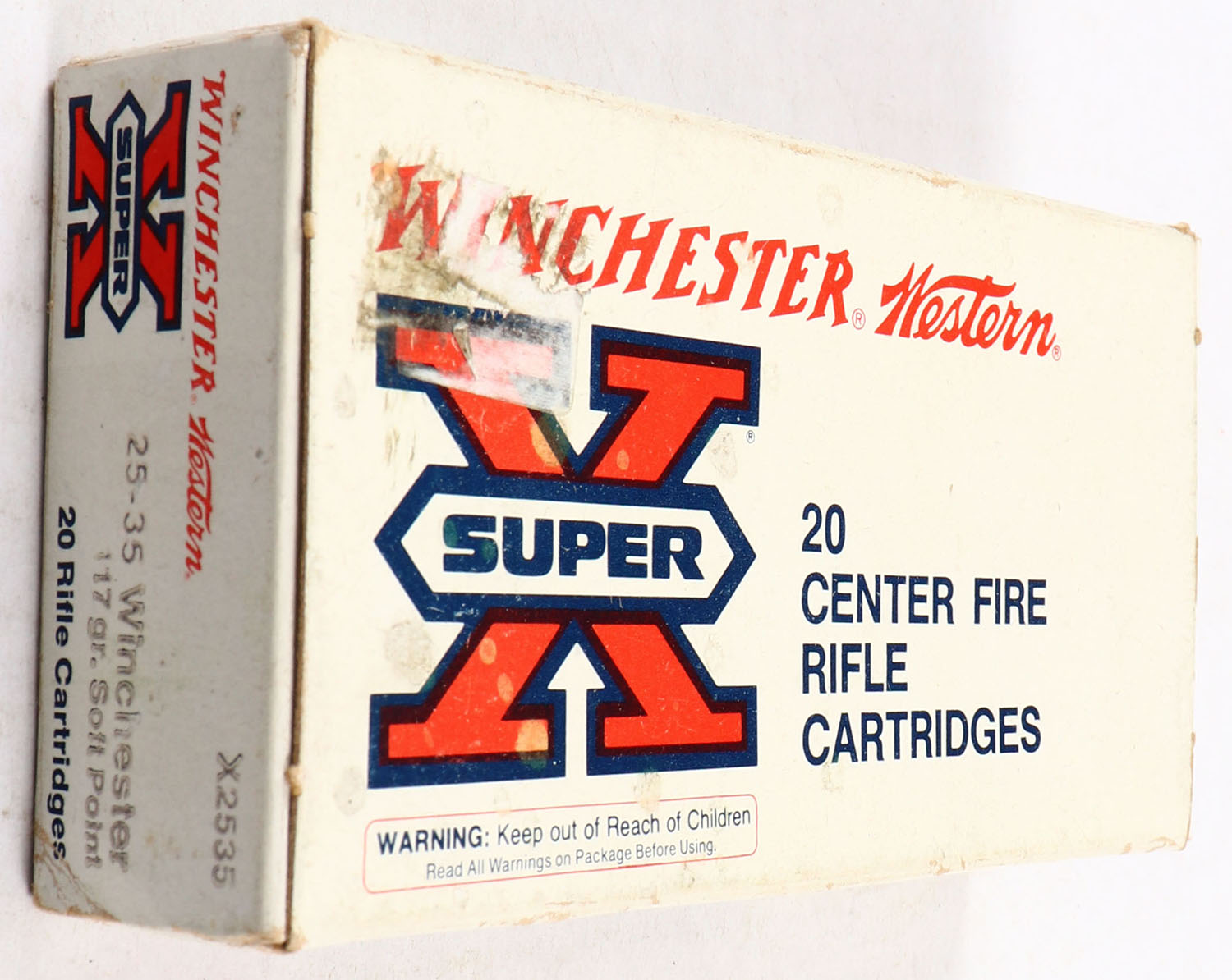 Winchester-Western, Super-X, .25-35 Winchester, 117 Grain Soft Point, Full, 1pc. White & red box, box is solid with excellent color, minor shelf wear, very minor corner wear, edges are crisp, end flaps are solid, stain on top, ammo is excellent. Grade: Excellent - Value: 50 to 150