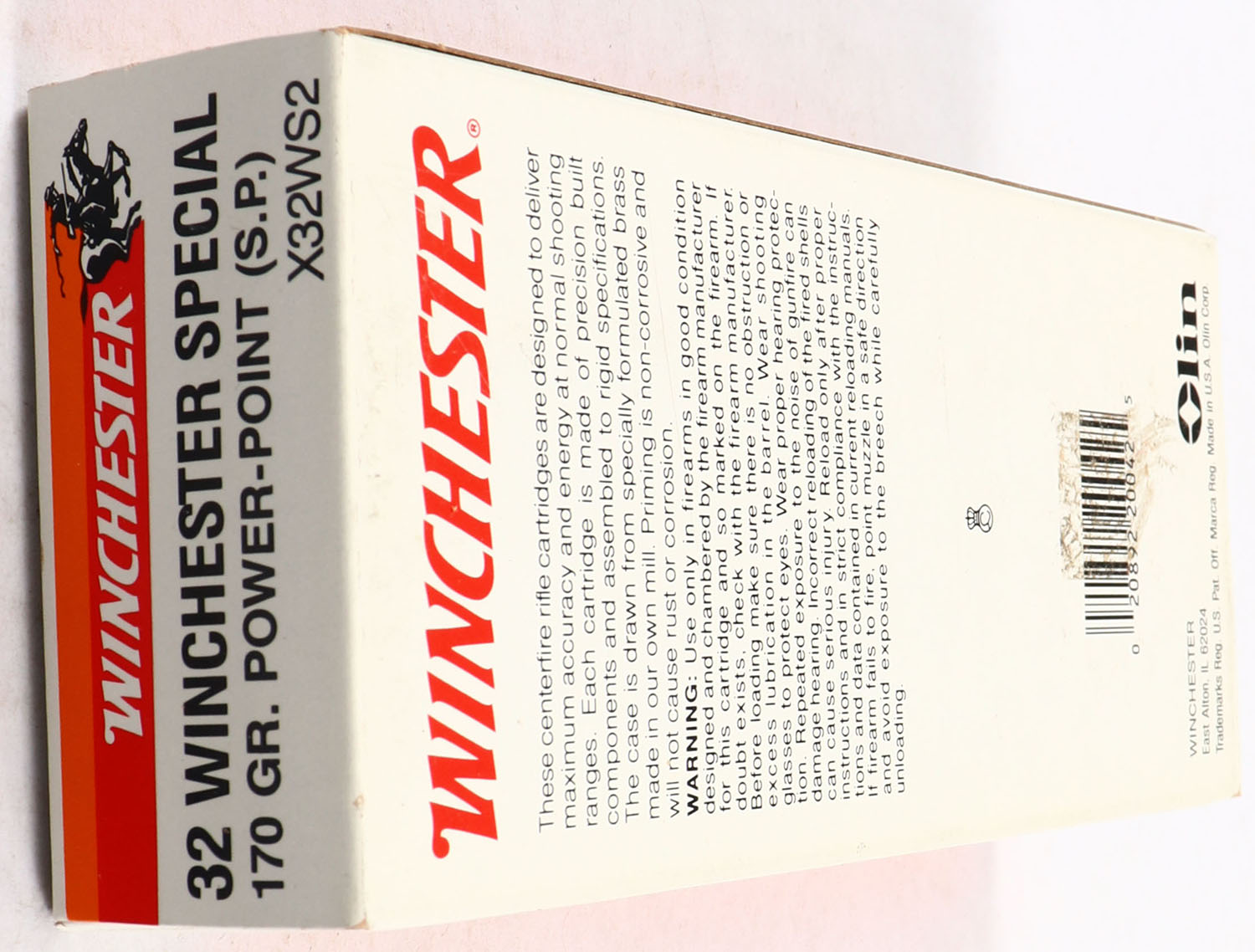 Winchester, Super-X, .32 Winchester Special, 170 Grain Power-Point, Full, 1pc. White red & orange box, box is near mint with minty color, edges are crisp, end flaps are solid, ammo is excellent. Grade: Excellent ++ - Value: 30 to 90