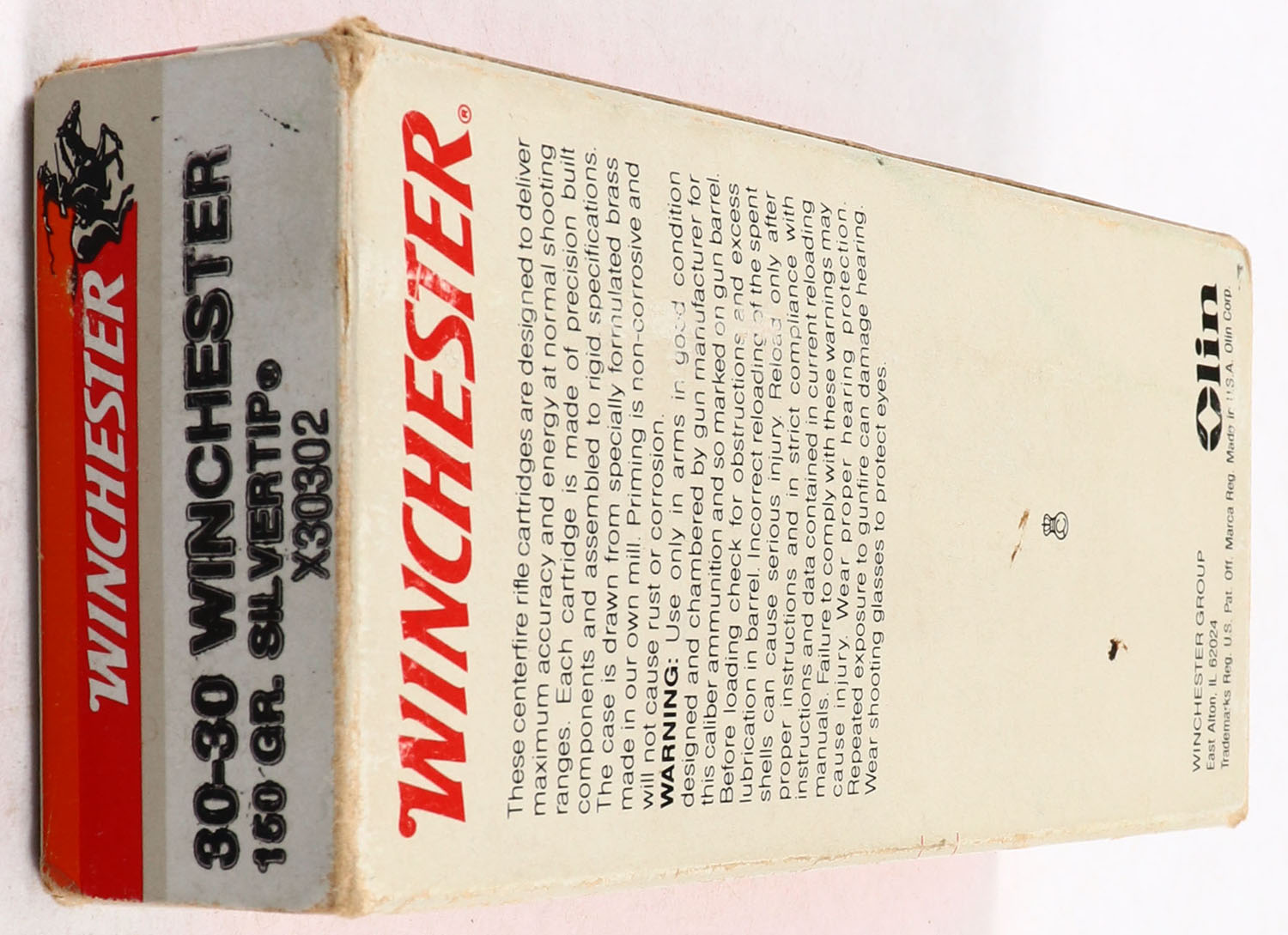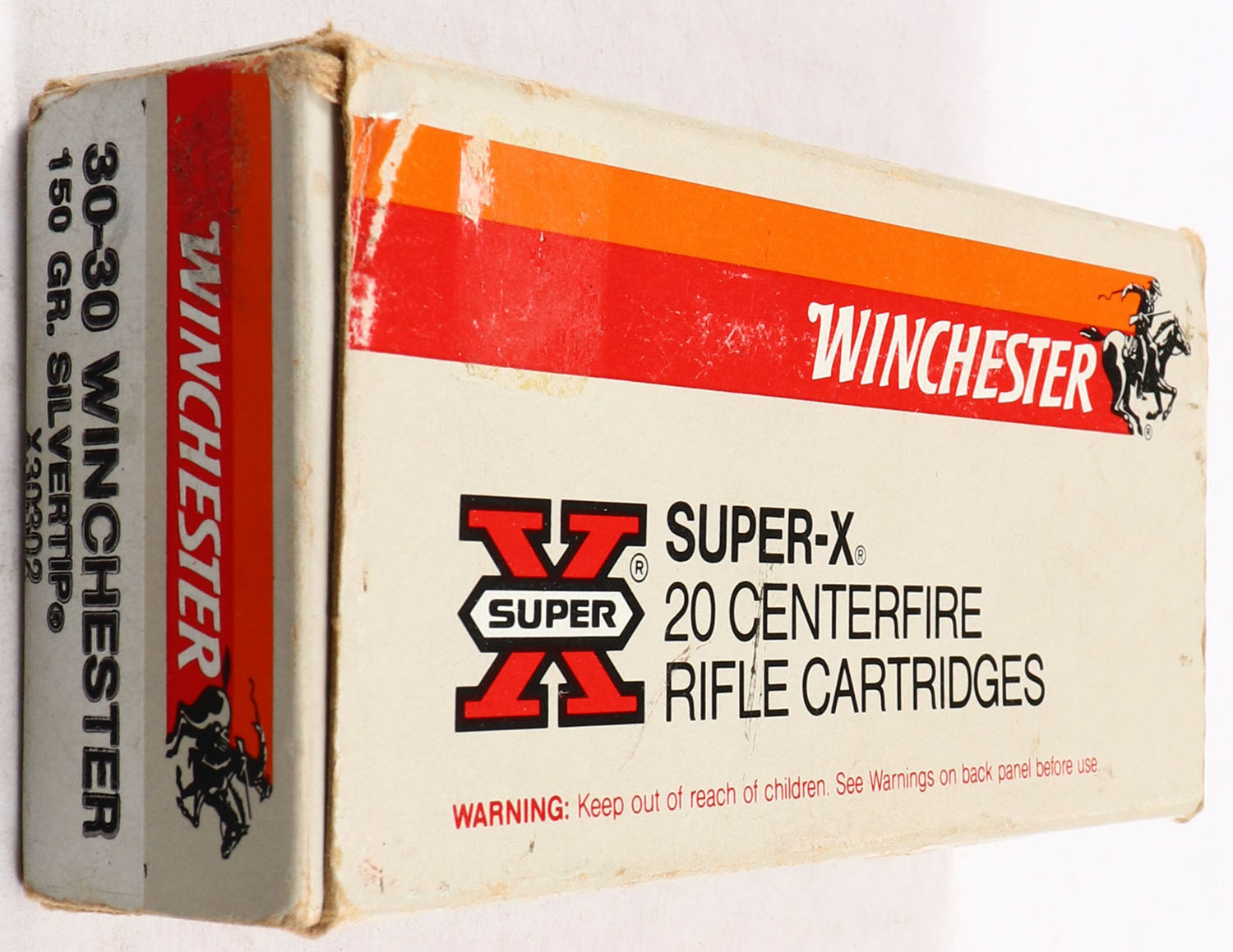 Winchester, Super X, .30-30 Winchester, 150 Grain Silvertip, Full with 11rds. Being correct, 1pc. White red & orange box, box is solid with good color, has edge & corner wear, end flaps are solid, ammo is excellent. Grade: Very Good + - Value: 10 to 40