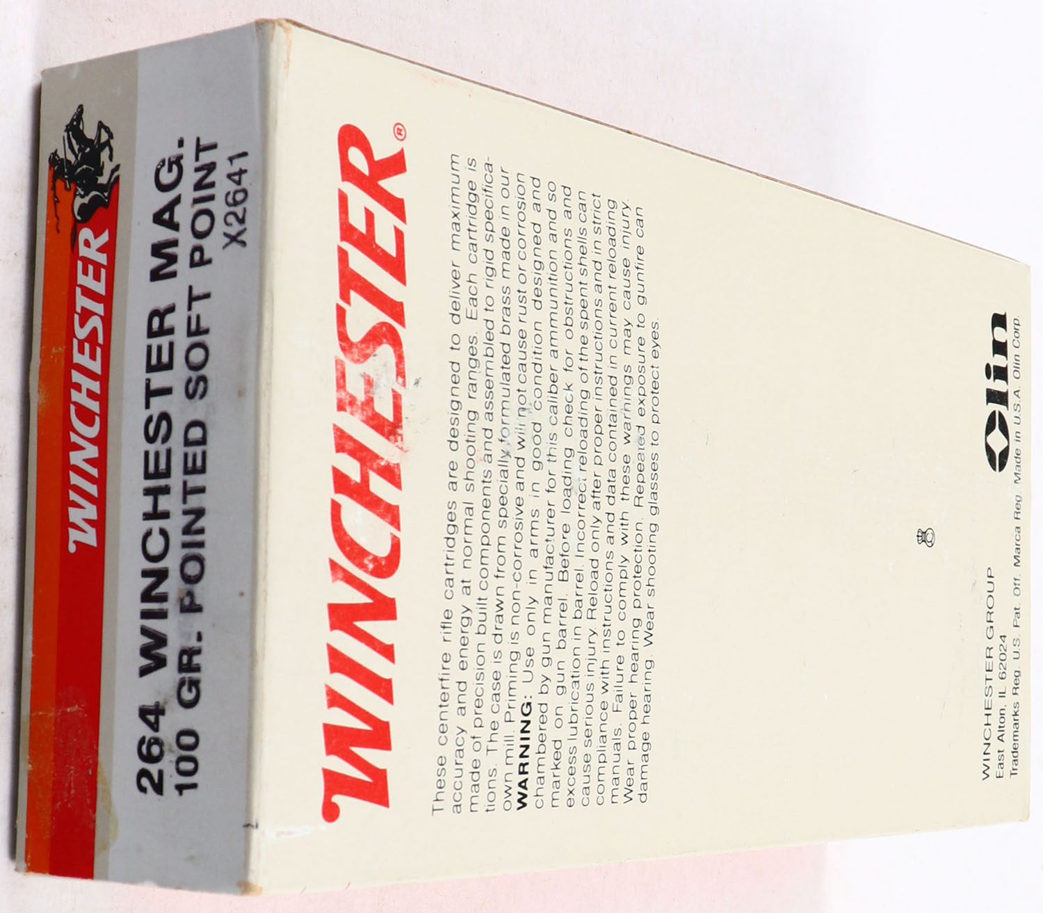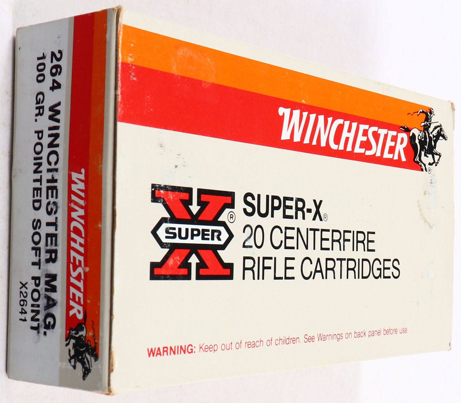 Winchester, Super X, .264 Winchester Magnum, 100 Grain Pointed Soft Point, Full, 1pc. White red & orange box, box is solid with excellent color, very minor corner wear, edges are mostly crisp, end flaps are solid, ammo is excellent. Grade: Excellent - Value: 20 to 60