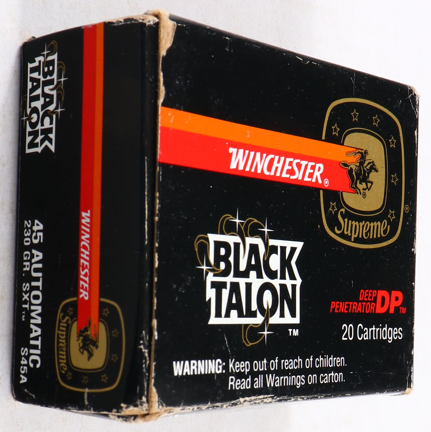 Winchester, Black Talon, .45 Automatic, 230 Grain SXT, Partial 17rds correct., 1pc. Black red & orange box, box is solid with good color, has edge & corner wear with light scuffing, end flaps are solid, ammo is very good. Grade: Very Good ++ - Value: 30 to 90