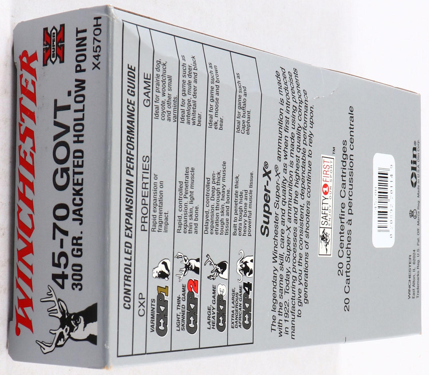 Winchester, Super X, .45-70 Govt, 300 Grain Jacketed Hollow Point, Full, 1pc. Silver & red box, box is solid with minty color, box has a crease to top, edges are crisp, end flaps are solid, ammo is excellent to minty. Grade: Excellent + - Value: 30 to 90