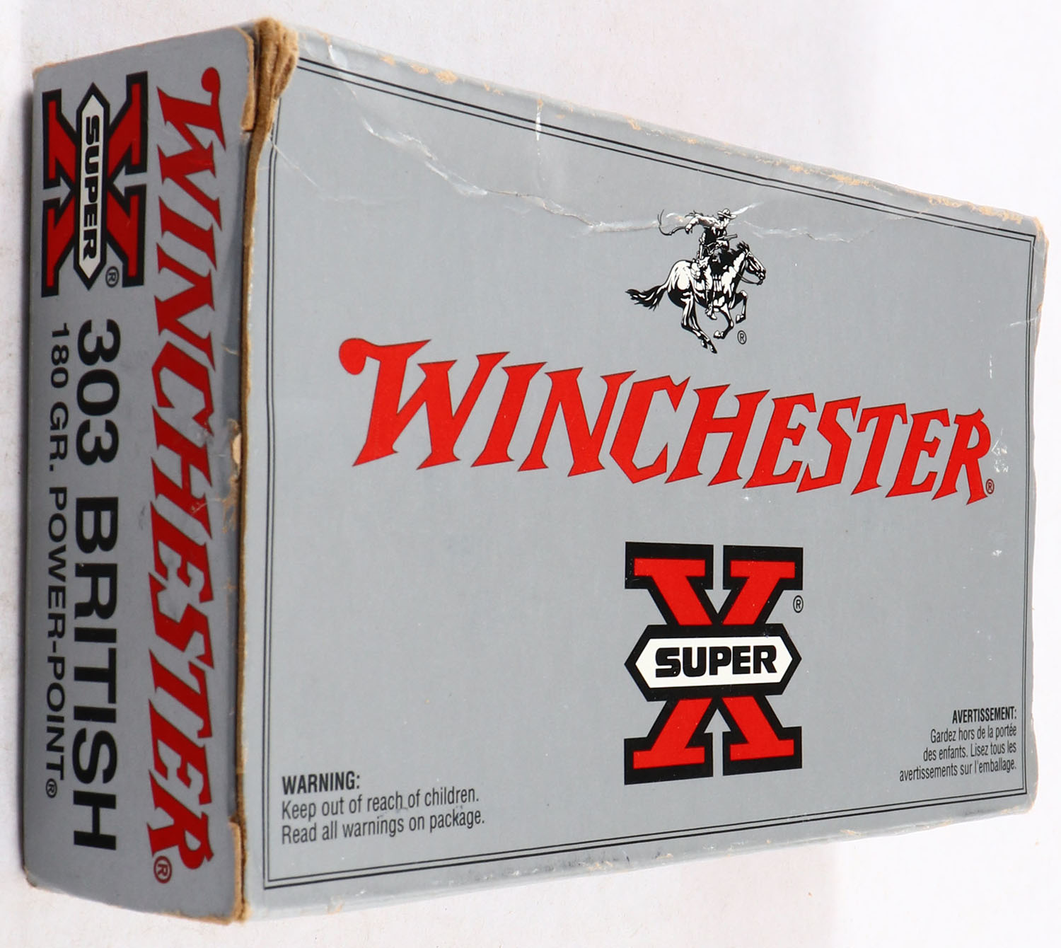 Winchester, Super X, .303 British, 180 Grain Power-Point, Full, 1pc. Silver & red box, box is solid with good color, minor shelf & corner wear, box has a crease on top back edge, end flaps are solid, ammo is excellent. Grade: Very Good + - Value: 20 to 60