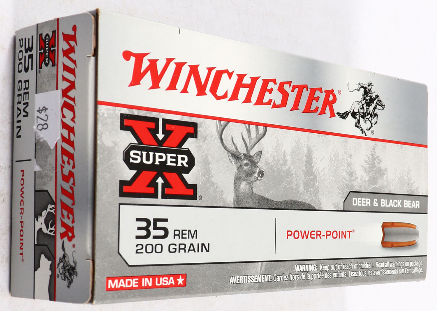 Winchester, Super X, .35 Rem., 200 Gr. Power Point bullet, 1pc, Full, gray box with black/red print, box is MINT with mint color, corners are sharp, edges are crisp, end flaps are solid, ammo is minty. Grade: MINT - Value: 30 to 90