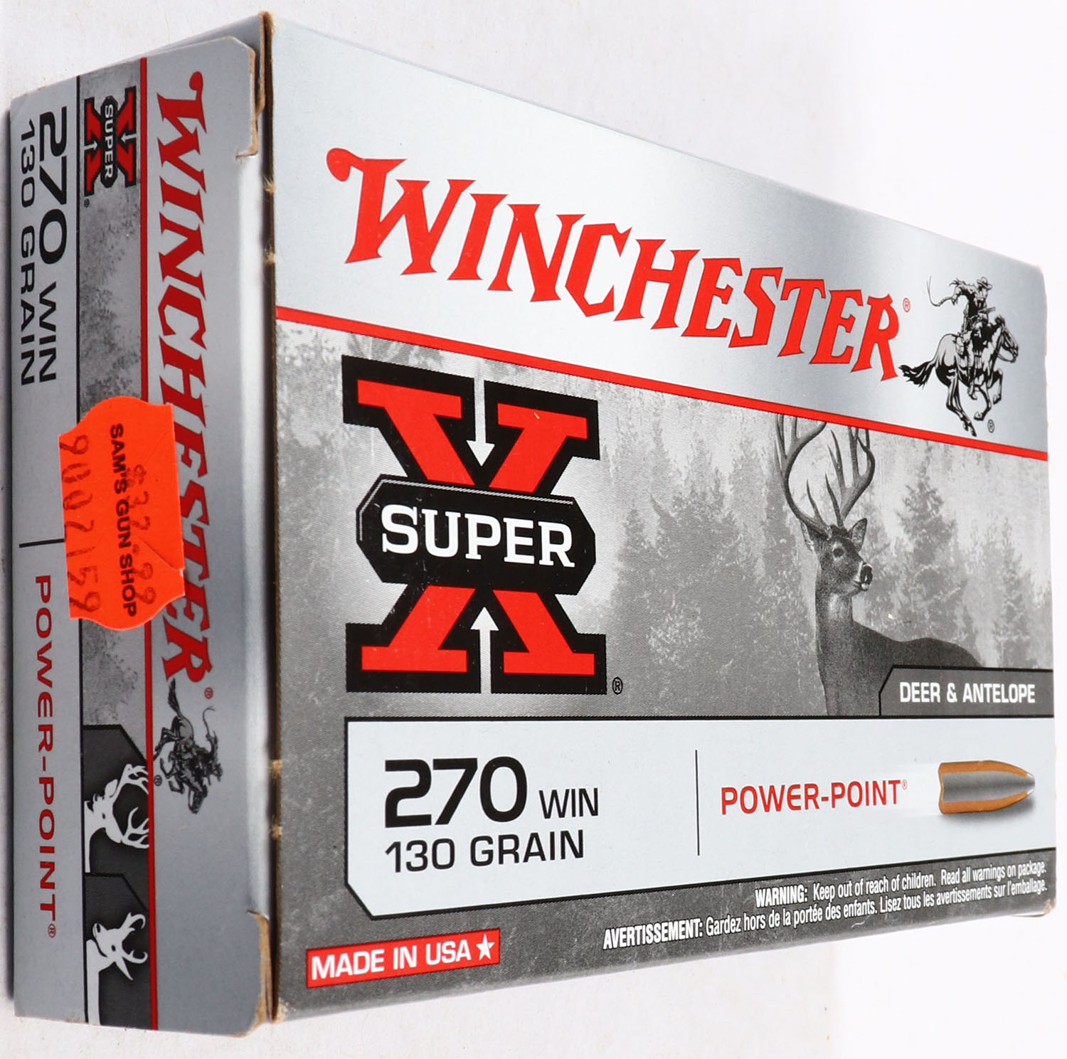 Winchester, Super X, .270 Win., 130 Gr. Power Point bullet, 1pc, Full, gray box with black/red print, box is very solid with excellent color, ammo is excellent. Grade: Excellent + - Value: 20 to 60
