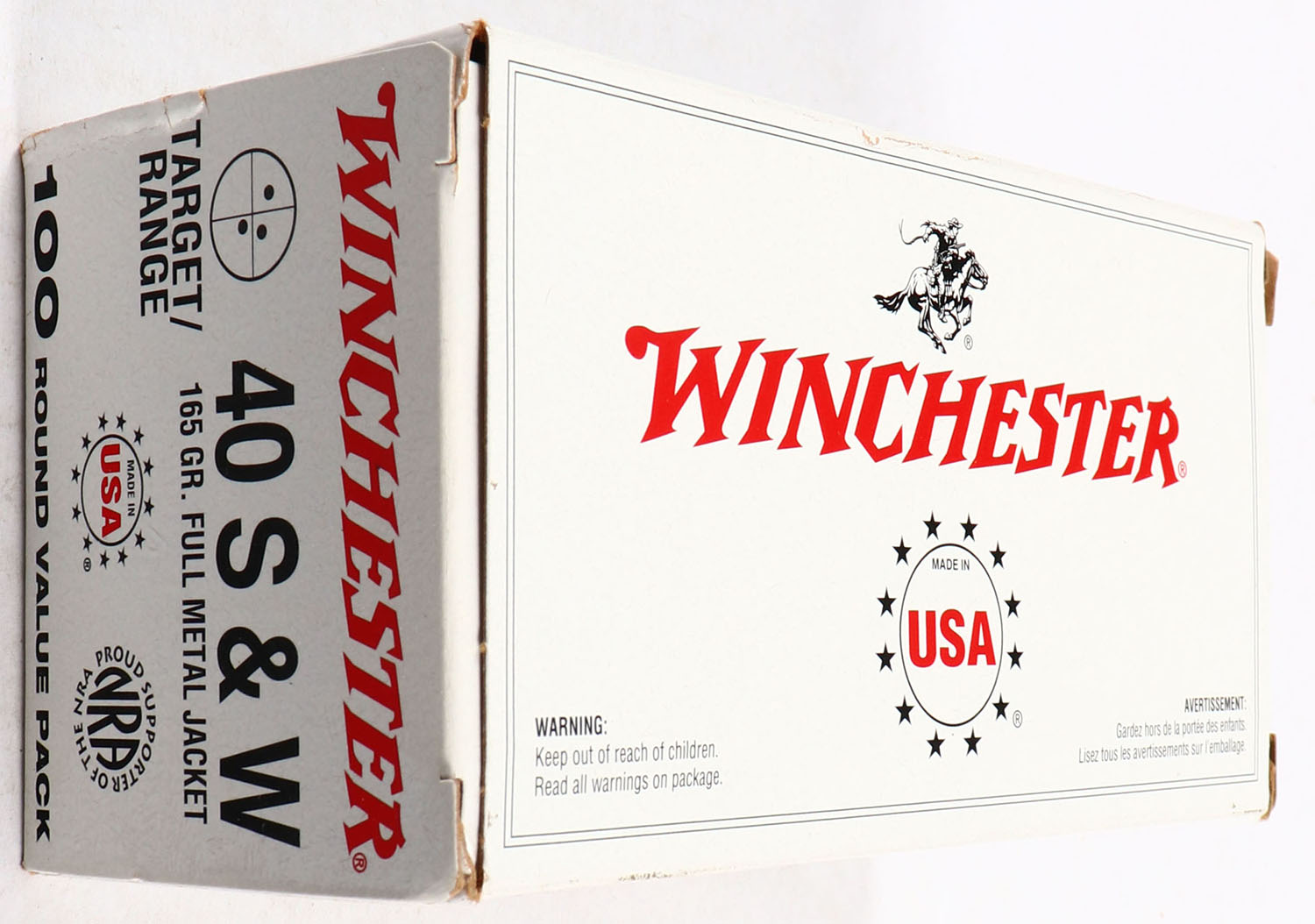 Winchester, .40 S&W, 165 Gr. FMJ, 1pc, Full 100rds., white box with black/red print, box is very solid, ammo is excellent. Grade: Excellent ++ - Value: 30 to 90