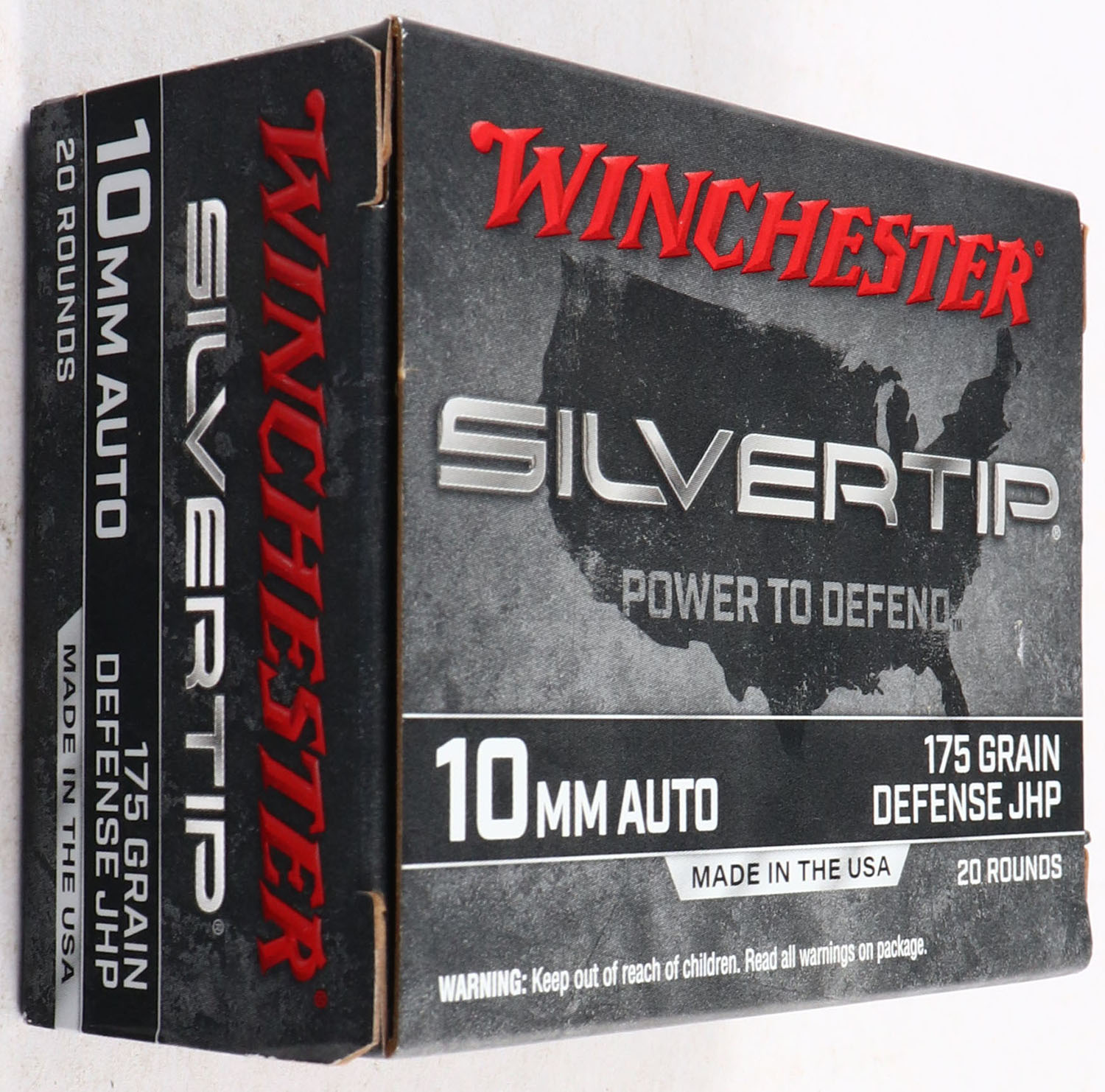 Winchester, Silvertip, 10mm Auto, 175 Grain Defense JHP, Full, 1pc. Black box with good color, corners are sharp, edges are crisp, end flaps are solid, ammo is minty. Grade: MINT - Value: 20 to 60