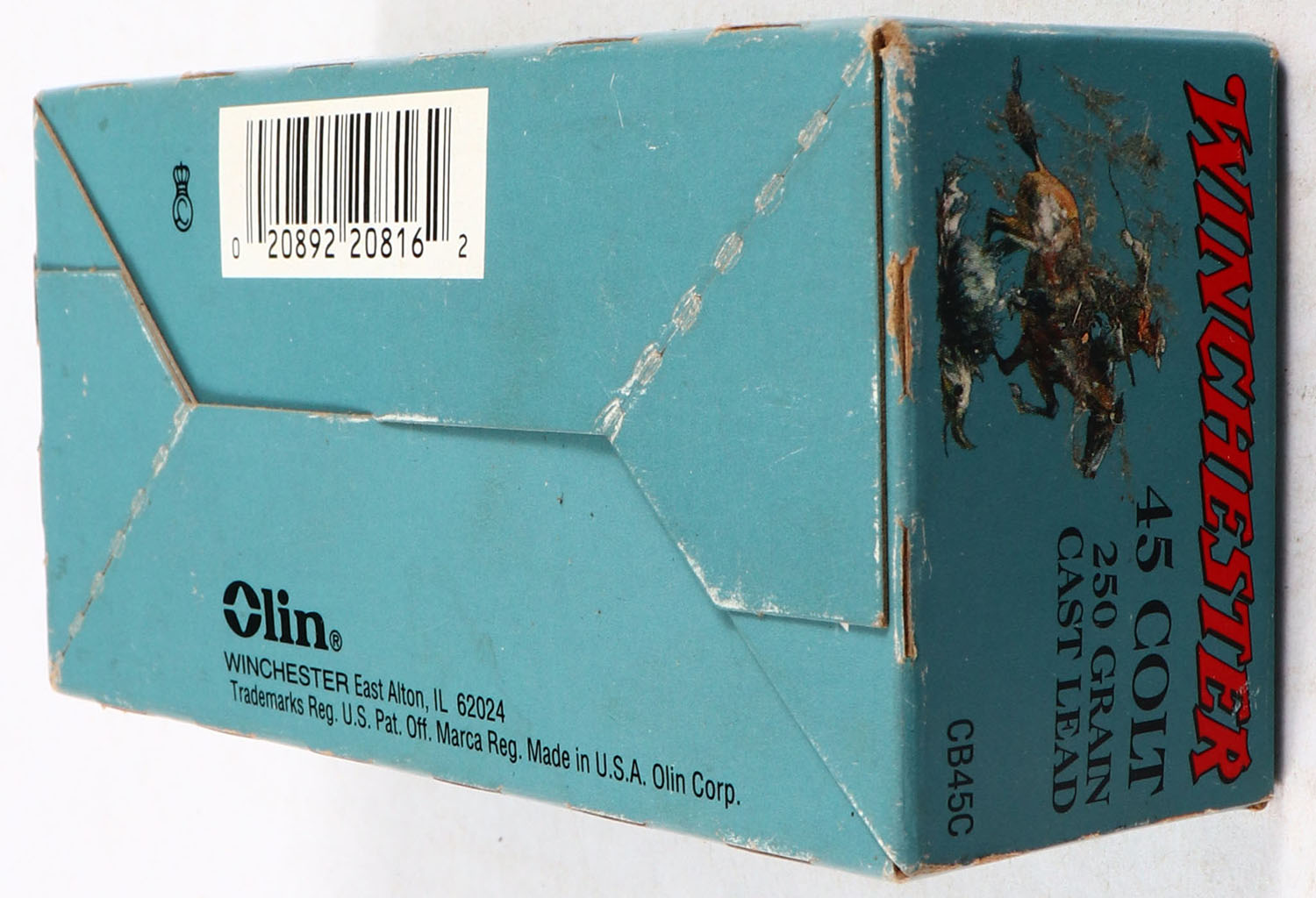 Winchester, Cowboy Action Loads, .45 Colt, 250 Grain Cast Lead, Full, 1pc. Blue box, box is very solid with excellent color, minor shelf & corner wear, edges are mostly crisp, top flap is solid, ammo is excellent to minty. Grade: Excellent - Value: 50 to 150