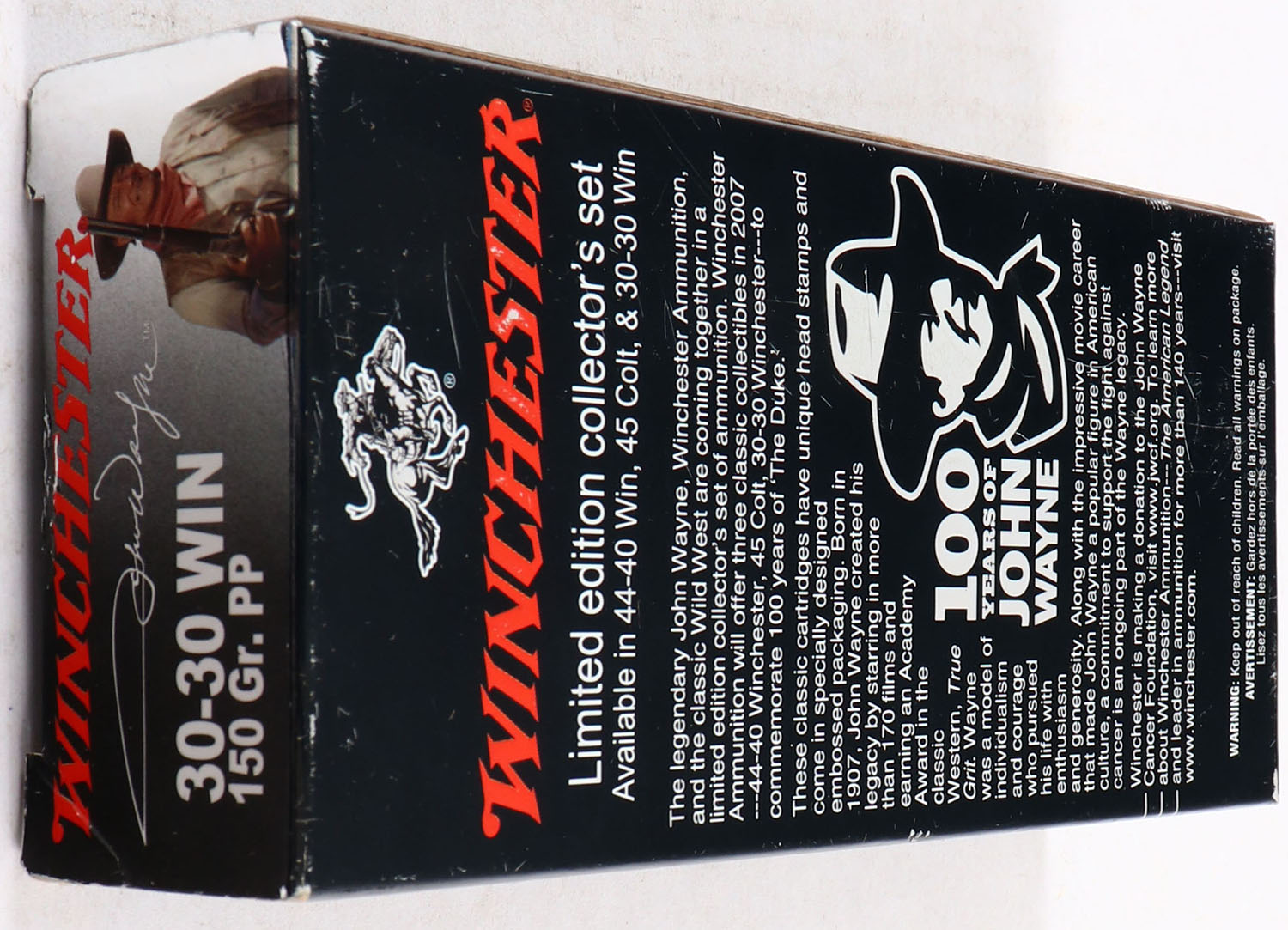 Winchester, 100 YEARS OF JOHN WAYNE BOX, 30-30 WIN, 1pc, Full, 150 Gr. PP, black & Silver box with red & white, John Wayne on box, warning label, nice bright box, light scuff, ammo is MINT. Grade: Excellent ++ - Value: 40 to 120