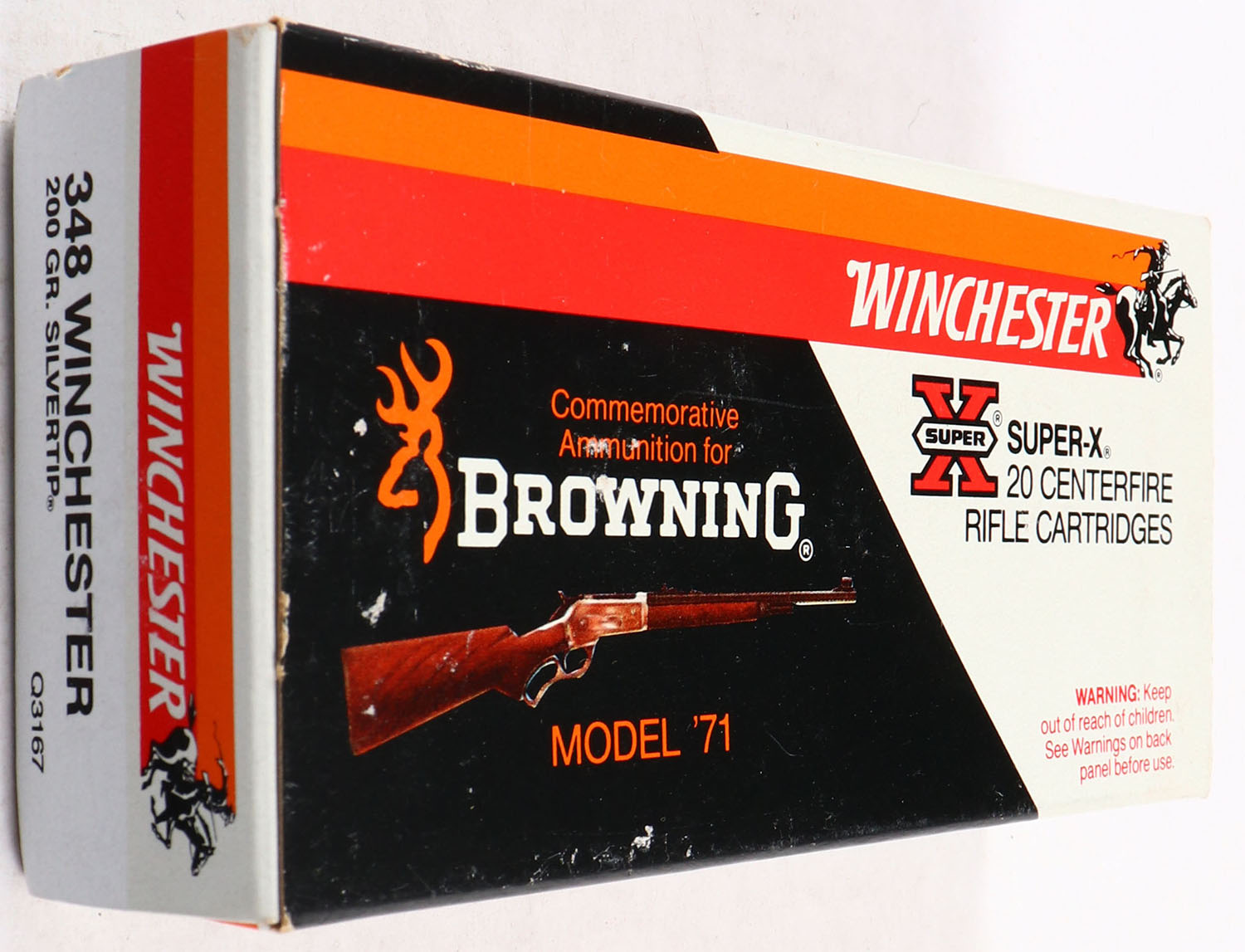 Winchester, Commemorative Ammunition for Browning Model '71, .348 Winchester, 200 Grain Silvertip, Full, 1pc. White & black box, box is solid with excellent color, some shelf wear, very minor corner wear, edges are mostly crisp, end flaps are solid, ammo is excellent. Grade: Excellent + - Value: 50 to 150