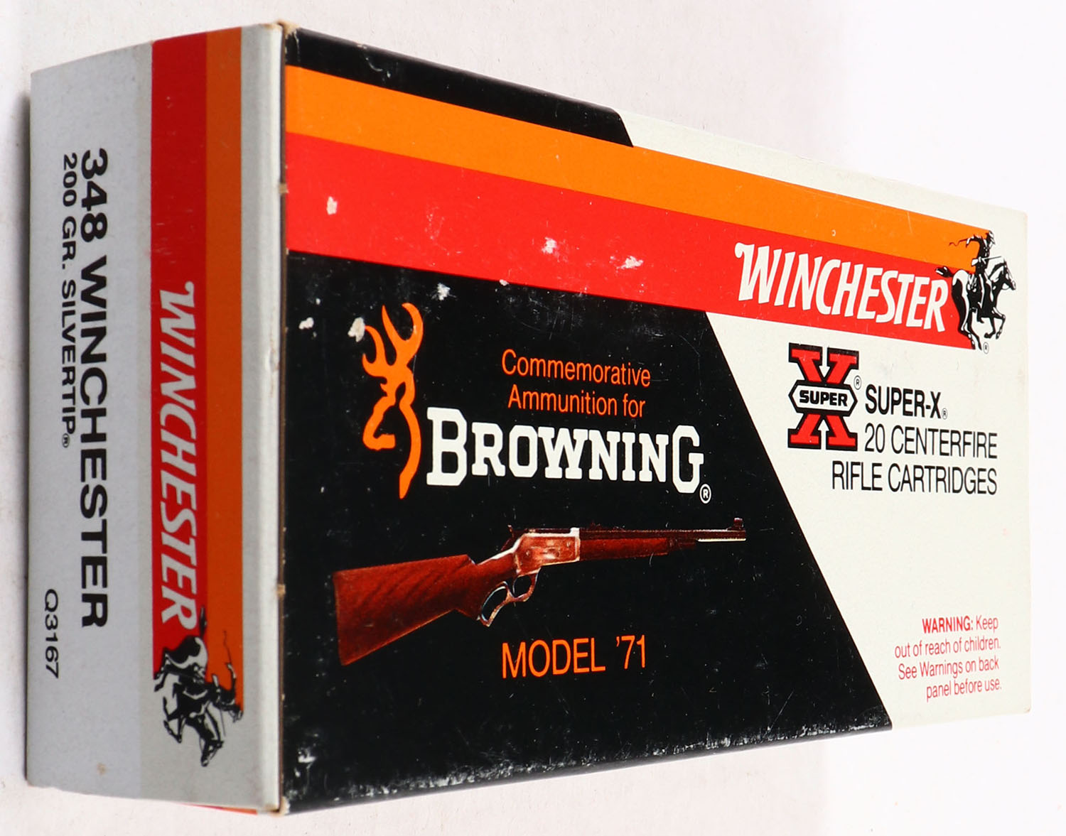 Winchester, Commemorative Ammunition for Browning Model '71, .348 Winchester, 200 Grain Silvertip, Full, 1pc. White & black box, box is solid with excellent color, some shelf wear, very minor corner wear, edges are mostly crisp, end flaps are solid, ammo is excellent. Grade: Excellent + - Value: 50 to 150