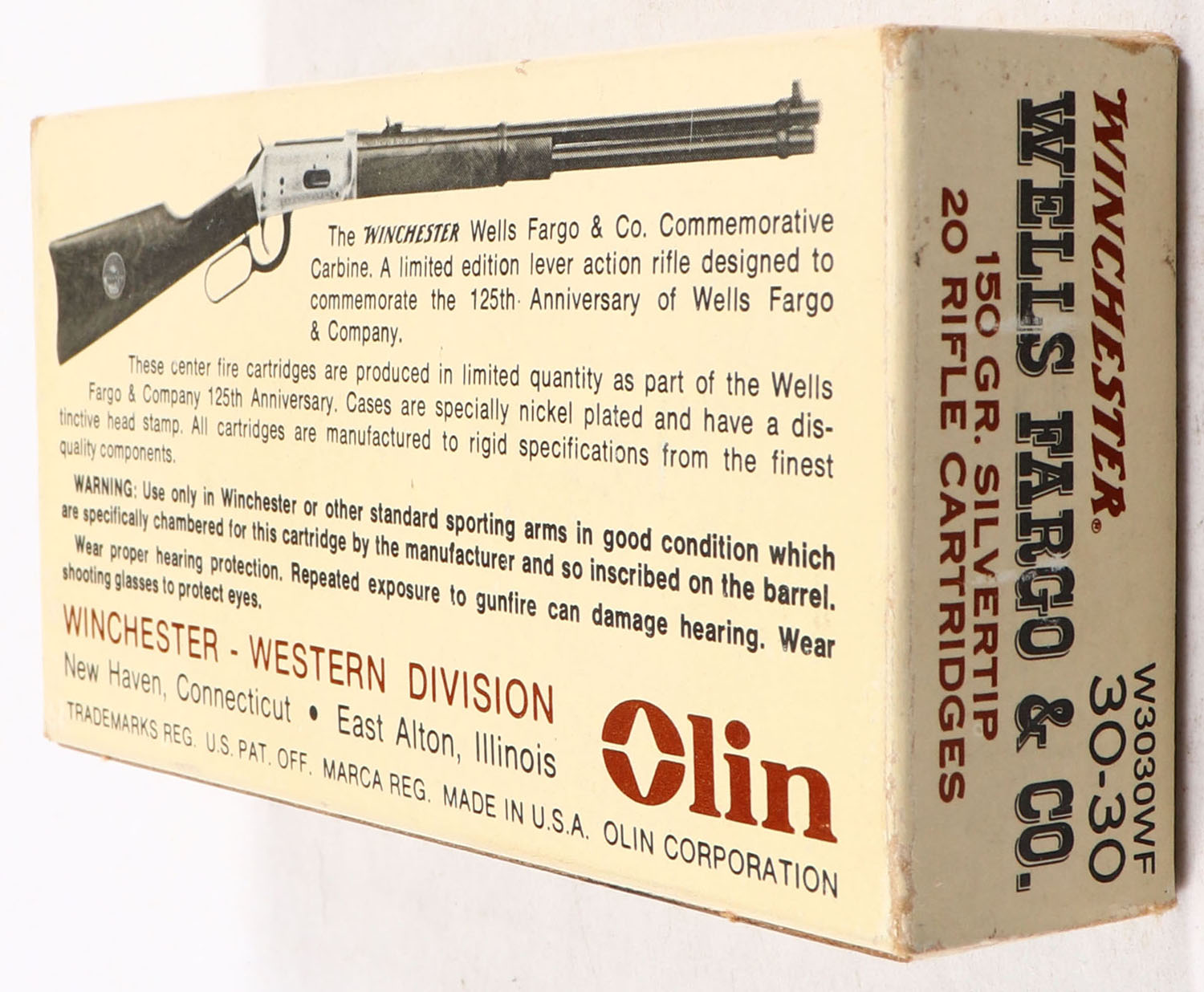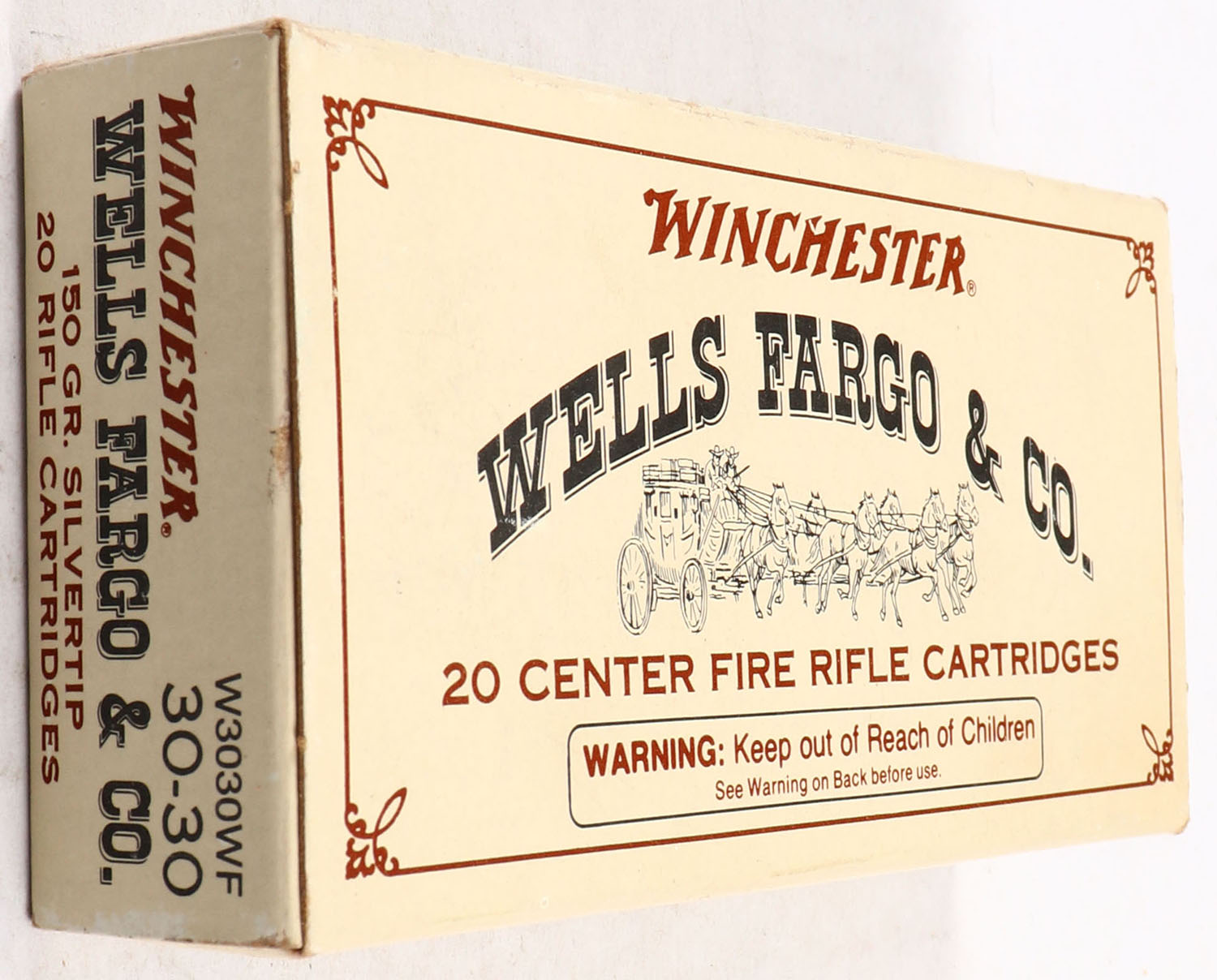 Winchester, Wells Fargo & Co., .30-30 Winchester, 150 Grain Silvertip, Partial 19rds., 1pc. Tan & brown box, box is solid with very good color, age soiling, some corner wear, edges are mostly crisp, end flaps are solid, ammo is minty. Grade: Excellent - Value: 10 to 50