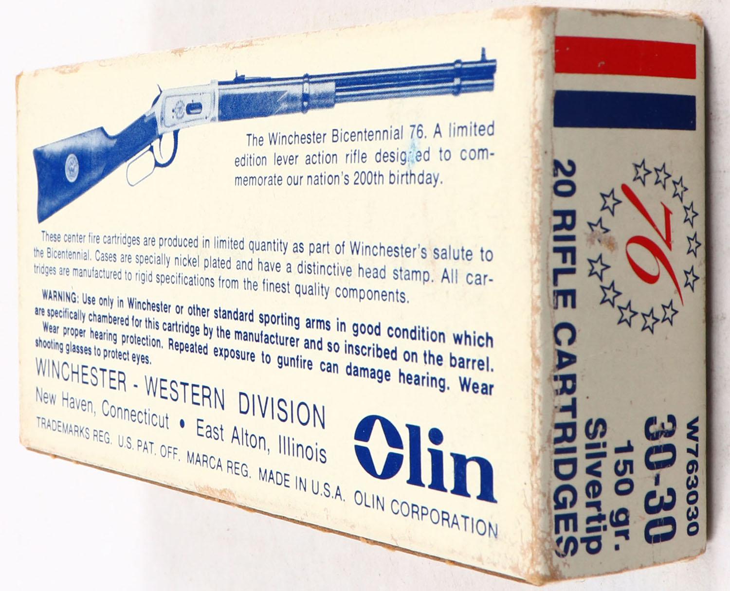 Winchester, Bicentennial, .30-30 Winchester, 150 Grain Silvertip, Full, 1pc. White blue & red box, box is solid with excellent color, box has shelf & corner wear, edges are crisp, end flaps are solid, ammo is minty. Grade: Excellent - Value: 20 to 60