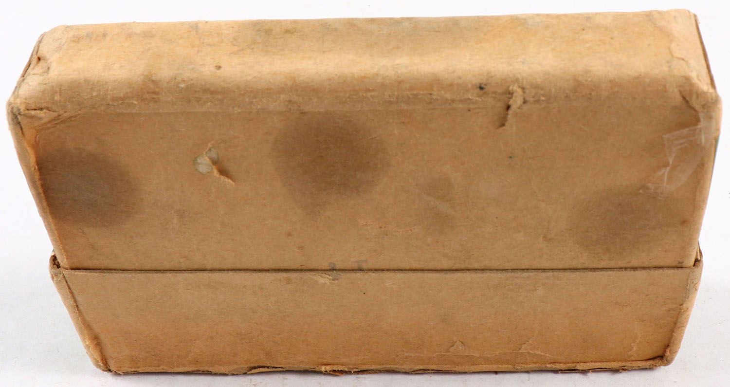 Western, .30 Cal Gov't Model 1906 (30-06), Smokeless Powder, 220 Gr. Soft point metal patched Bullet, 2pc, Full, buff box with green label & black/red print, box is solid with rub marks, edge wear, & seam split to top box, ammo is very good. Grade: Very Good - Value: 50 to 150