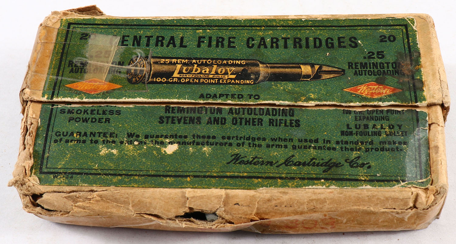 Western, .25 Remington Autoloading, 100 Gr. Open Point Expanding LUBALOY Bullet, smokeless, 2pc, Full of mixed manufactures, buff box with green label & black/red print, box has soiling with edge & corner wear, has tape repairs to bottom, ammo is good. Grade: Good + - Value: 30 to 120