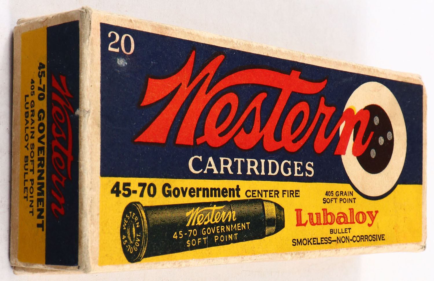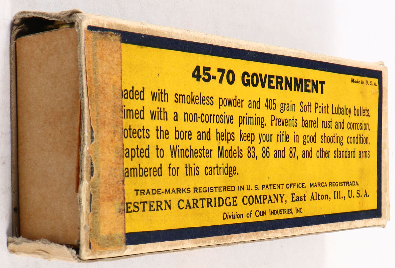 Western, .45-70 Government, 405 Gr. Soft Point Lubaloy Bullet, Smokeless, 1pc, Partial 12rds., buff box with blue/yellow label & black/red print, right end flap is missing, very good to excellent color, minor age soiling, light edge wear, ammo is very good. Grade: Very Good - Value: 20 to 80